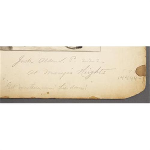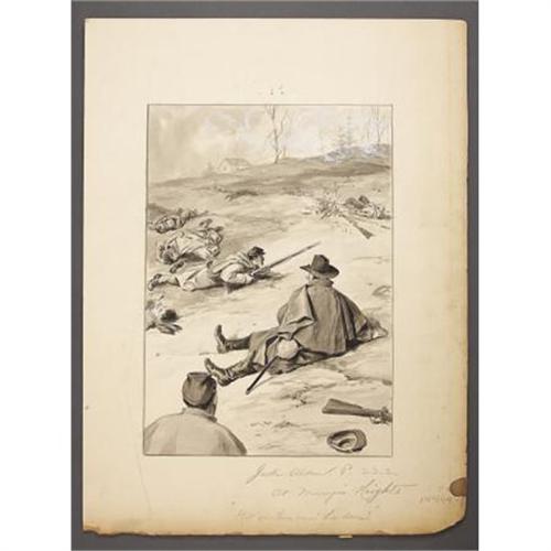 <B>MARYES HEIGHTS – AN ORIGINAL CIVIL WAR GOUACHE.</B></I> Robert Merrill is a well known American book illustrator, and his name appears as an 1865 Civil war enlistee. Regardless of his lack of colorful war career, he is arguably a fine artist. Merrill’s images appear in Warren Lee Goss’ <I>Jack Alden</B></I> published in 1890. He is also listed in the <I>Dictionary of American Artists, Sculptors, and Engravers</B></I>. This beautiful image in gouache image measures approximately 8.75" x 12.25" on card 13.25" x 18". In period pencil on card, "Jack Alden. P. 222 At Marye’s Heights. '<I>Get down there, men! Lie down!'" </B></I> Fantastic original art from this elusive artist.<BR><BR><B>Condition:</B></I> Fine, bottom right corner broken, and chips at bottom edge.<BR><BR><b>Shipping:</b> Flat Material, Small (<a target="_blank" href="http://www.heritageauctions.com/common/shipping.php">view shipping information</a>)