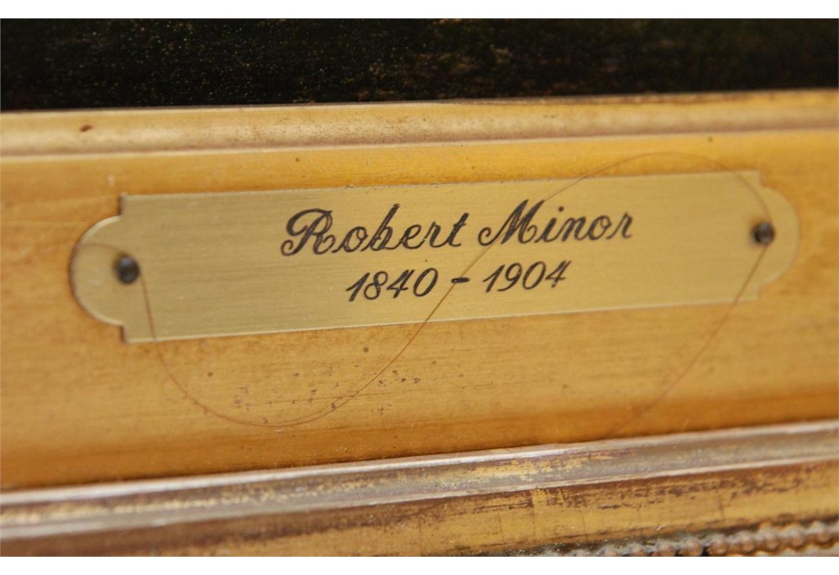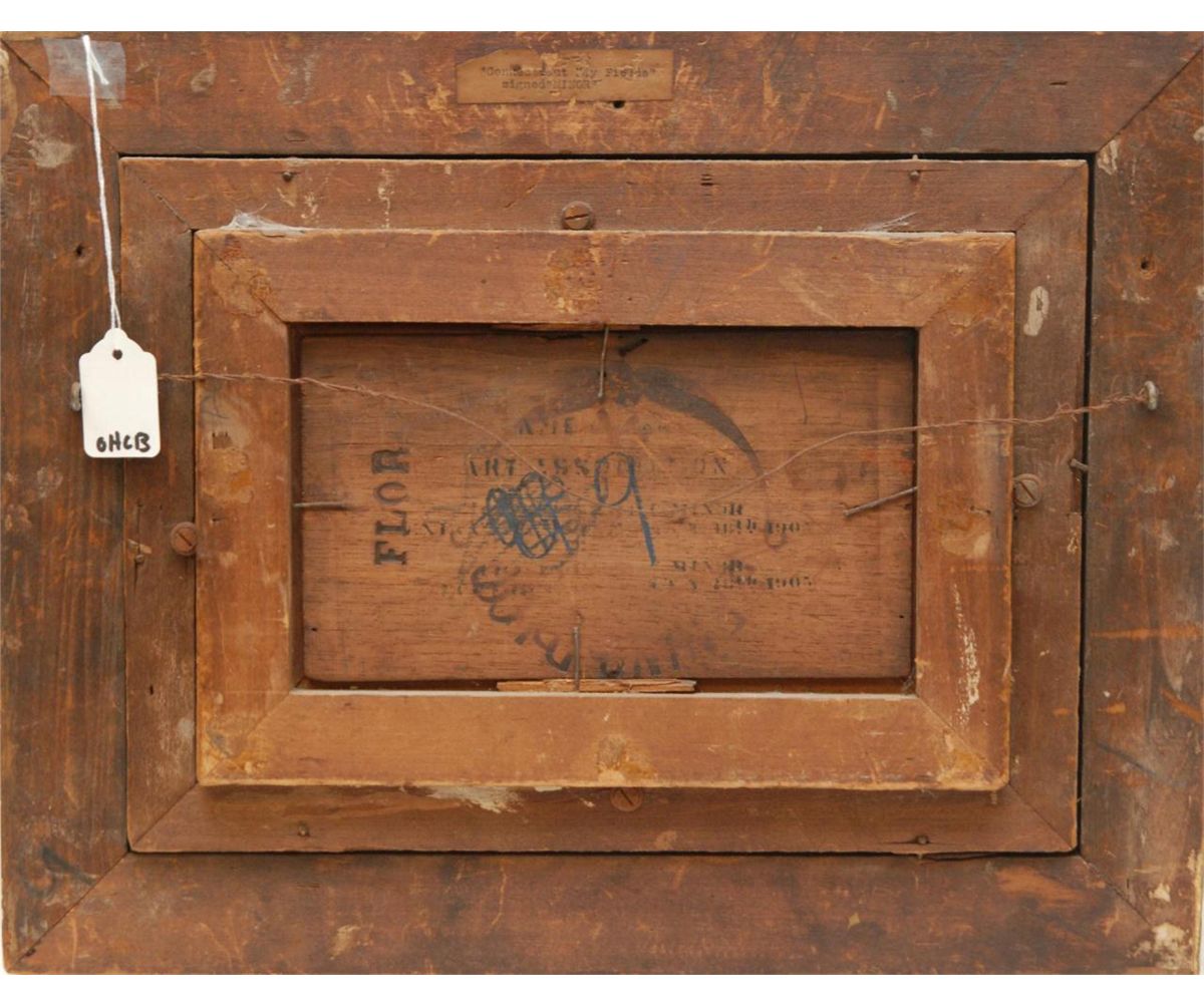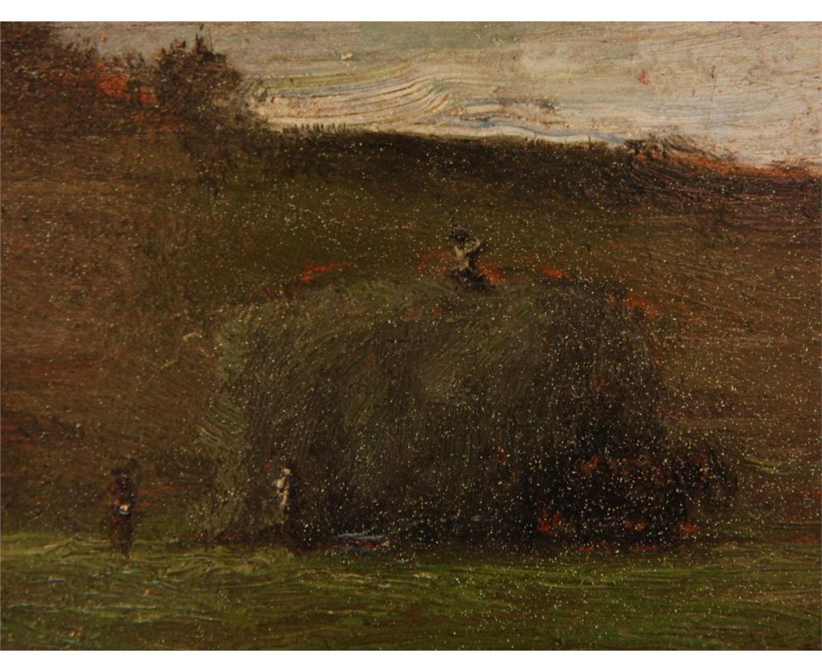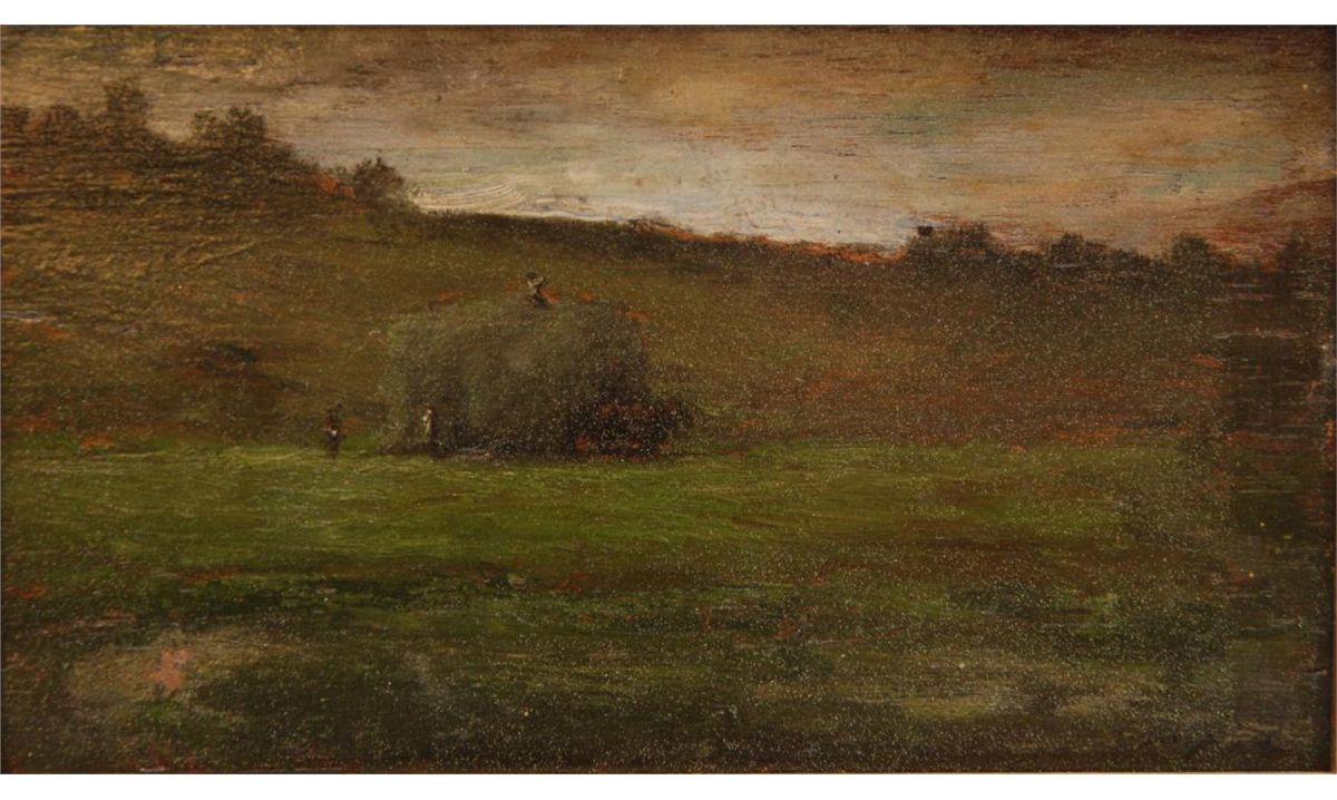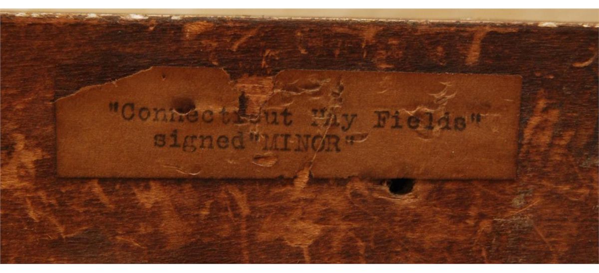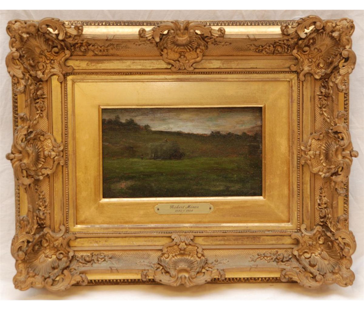 Robert Crannell Minor (AMERICAN, 1840-1904) oil painting on board depicting a lanscape scene with farmers bundling hay. Signed 'Minor' to lower right. Titled to original label on verso 'Connecticut Hay Fields'. Mounted in floral gilded wood frame. Measures 7 1/2" height x 11 1/4" width + 2 3/4" frame (19cm x 28.5cm + 6.9cm). Provenance: Sam Feldman Collection.