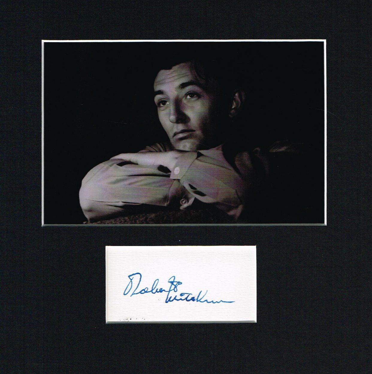 An autograph from movie star Robert Mitchum. Mitchum is rated number 23 on the American Film Institute's list of the greatest male stars of Classic American Cinema. Professionally mounted and framed.