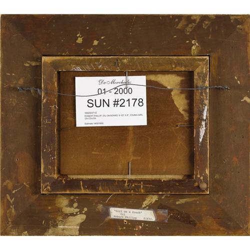 <B>ROBERT PHILIPP</B></I> (American 1895-1981)<BR><I>Girl On A Couch</B></I><BR>Oil on board<BR>6-1/8 x 8 inches (15.6 x 20.3 cm)<BR>Signed lower right<BR><BR>Provenance:<BR>Sale, Du Mouchelles, Detroit, January 2000, Lot 2178;<BR>Private collection (Connecticut)<BR><BR> <B>Condition Report:</B> In original condition<BR><BR><b>Shipping:</b> Requires 3rd Party Shipping (<a target="_blank" href="http://www.heritageauctions.com/common/shipping.php">view shipping information</a>)