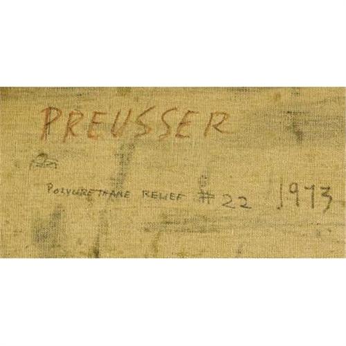 <B>ROBERT PREUSSER (1919-1992)</B></I><BR><I>Polyurethane Relief #22</B></I><BR>Polyurethane and mixed media on canvas<BR>39-1/2 x 39-1/2 inches (100.3 x 100.3 cm)<BR>Signed, dated, and titled verso<BR><BR> Experimentation in art was a lifelong pursuit of Robert Preusser. It comes as no surprise that experimentation with materials and media were part of that process. As new polymers and plastics were invented, Preusser embraced their use. This playful and vibrant work results from the use of a mixture of new and old materials.<BR><BR>Provenance:<BR>Estate of Robert Preusser<B>Condition Report:</B> Excellent condition. Period frame in excellent condition.<BR><BR><b>Shipping:</b> Requires 3rd Party Shipping (<a target="_blank" href="http://www.heritageauctions.com/common/shipping.php">view shipping information</a>)