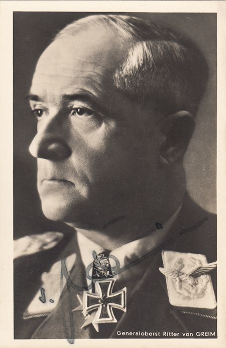 (1892 - 1945) German Field Marshal and last head of the Luftwaffe, a Knights Cross winner involved in the invasion of Poland, the Battle for Norway, the Battle of Britain and Operation Barbarossa. His final words before taking cyanide were: "I am the head of the Luftwaffe, but I have no Luftwaffe." S.P. 3 1/2" x 5 1/2" b/w, a chest, up pose in uniform by Hoffmann, signed at bottom. Near fine.