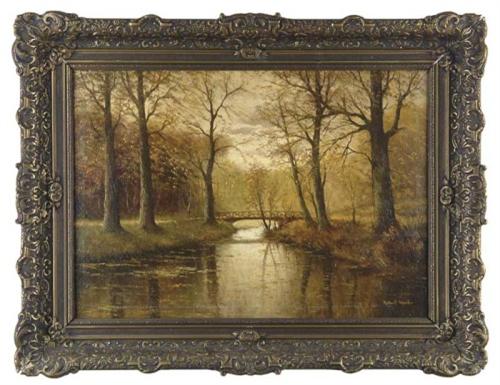 ROBERT WILLIAM WOOD (American, 1889-1979) GOLDEN GLOW. Superb oil on canvas fall landscape shows a stream with bridges lined with grassy banks having tall trees all with golden foliage. Sunlight shows behind light clouds and everything reflects in the water. Signed lower right. Housed in its original fine gesso decorated frame. SIZE: 20" x 28". CONDITION: Very good. 9-27960
