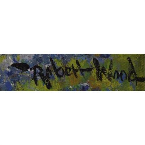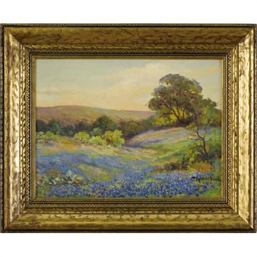 <B>ROBERT WOOD (1889-1979)</B></I><BR>Untitled Bluebonnets<I>,</B></I> early 1930s<BR>Oil on canvas<BR>12 x 16 inches (30.5 x 40.6 cm)<BR>Signed lower right<BR><BR> This painting was purchased from Robert Wood in the early 1930s. It was originally signed "G. Day." In 1976 the owners, concerned that the "G. Day" pseudonym would not be recognized as a true Robert Wood painting, took it to the Sigoloff Gallery for Robert Wood to re-sign.<BR><BR>Wood covered the original "G. Day" signature and re-signed the painting "Robert Wood." In addition, his daughter, Florence Wood, wrote the following about the painting:<BR><I><BR>Aug 6th 1976<BR><BR>I certify this 12 x 16 G. Day Bluebonnet is an original and authentic painting painted by my father Robert Wood circa 1930. This Bluebonnet with the oak tree on the right and rolling hills in the background was painted northwest of San Antonio. The colors are still beautiful after all of these years.<BR><BR>Florence Wood<BR>Daughter of Robert Wood</B></I><BR><BR>Provenance:<BR>Acquired from the artist by the present owner<B>Condition Report:</B> Excellent condition. Period frame in excellent condition.<BR><BR><b>Shipping:</b> Requires 3rd Party Shipping (<a target="_blank" href="http://www.heritageauctions.com/common/shipping.php">view shipping information</a>)