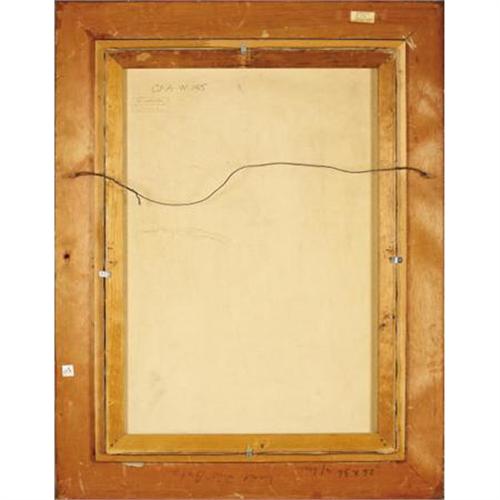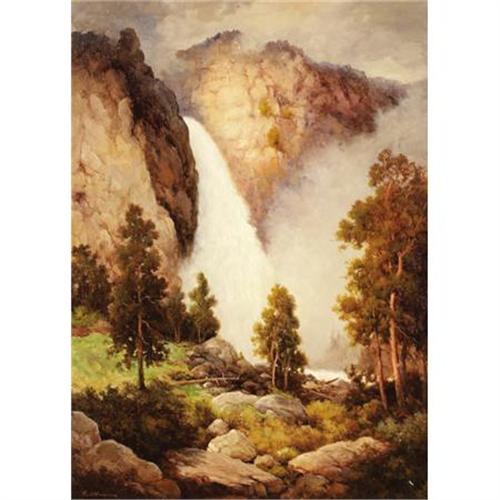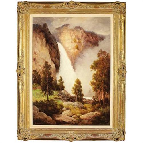 <B>ROBERT WOOD (1889-1979)</B></I><BR><I>Yosemite Falls</B></I>, 1935<BR>Oil on canvas<BR>36 x 26 inches (91.4 x 66.0 cm)<BR>Signed lower right<BR>Titled verso<BR><BR> This majestic depiction of lower Yosemite Falls is from the personal collection of Robert Wood, as evidenced by the collection stamp on the back of the painting.<BR><BR>Yosemite Falls has the largest drop of all waterfalls in North America at 2,425 feet. It consists of three sections: the upper falls, the cascades, and the lower falls. Lower Yosemite Falls is the most approachable of the entire valley's falls. It is a gentle walk through the forest to the base of the falls. In springtime, with huge volumes of water, the viewing area is drenched with spray. This is probably why Wood takes the viewpoint to the opposite side of the spray. His perspective is very near the base of the falls.<BR><BR>This painting dates from the mid 1930s and would have been painted on one of Robert Wood's first trips out west. It is a spectacular early painting by the artist that compares favorably with the great tradition of landscape painters who have painted the subject.<BR><BR>Stamp verso:<BR>Collection of Robert Wood<B>Condition Report:</B> Excellent condition. Period frame in excellent condition.<BR><BR><b>Shipping:</b> Requires 3rd Party Shipping (<a target="_blank" href="http://www.heritageauctions.com/common/shipping.php">view shipping information</a>)