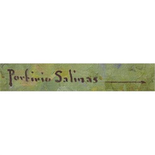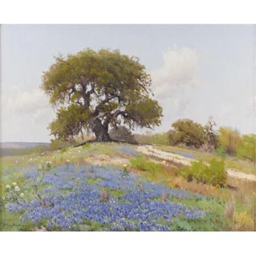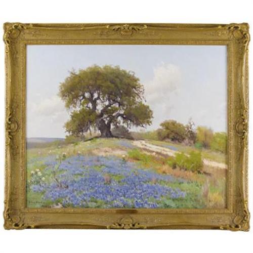 <B>PORFIRIO SALINAS (1910-1973)</B></I><BR><I>Bluebonnet Time</B></I>, 1940s<BR>Oil on canvas<BR>27 x 33 inches (68.6 x 83.8 cm)<BR>Signed lower left<BR><BR> This Porfirio Salinas bluebonnet painting is built around a monumental central oak tree in the middle of the painting. This differs from most bluebonnet compositions, where objects such as trees or farm houses frame the sides, and draw the eyes to the relatively vacant center. In this painting, the eyes are drawn to the center because the stately old oak tree dominates the scene. There is no doubt Porfirio Salinas could paint the stately Texas oak tree better than just about any artist.<B>Condition Report:</B> Excellent original condition. There is cracking in the sky, but the paint is well adhered. Period frame in excellent condition.<BR><BR><b>Shipping:</b> Requires 3rd Party Shipping (<a target="_blank" href="http://www.heritageauctions.com/common/shipping.php">view shipping information</a>)