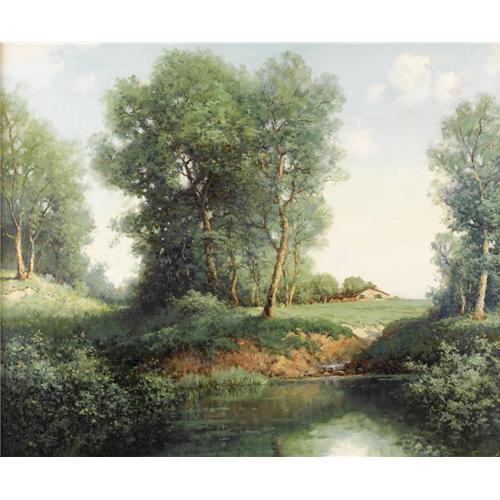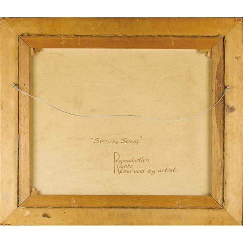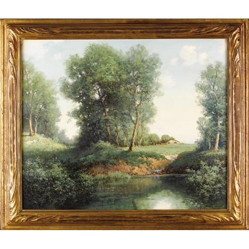 <B>ROBERT WOOD (1889-1979)</B></I><BR><I>Spring Song,</B></I> 1946<BR>Oil on canvas<BR>25in. x 30in.<BR>Signed and dated lower left<BR>Titled verso<BR><BR>Painted five years after Robert Wood left Texas, there is no denying that the Texas landscape, Jose Arpa, and the legacy of Julian Onderdonk, changed Robert Wood's art forever. From his "Buckeye" paintings, to his light-filled canvases, Robert Wood was transformed by the Lone Star State.<BR><BR>In this painting, there is interplay between light and shadow, particularly between the shady areas of the foreground and the light-filled areas of the midground.<BR><BR> <B>Condition Report:</B> Excellent condition. Period frame in excellent condition.<BR><BR><b>Shipping:</b> Requires 3rd Party Shipping (<a target="_blank" href="http://www.heritageauctions.com/common/shipping.php">view shipping information</a>)