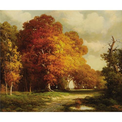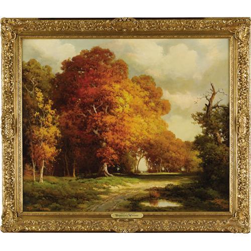 <B>ROBERT WOOD (1889-1979)</B></I><BR><I>Texas in November</B></I><BR>Oil on canvas<BR>25in. x 30in.<BR>Signed lower left<BR>Titled verso<BR><BR>A magnificant Texas fall scene with large red oaks, a caliche road, and a tiny red roofed house through the opening in the trees.<BR><BR>Provenance:<BR>Bendann's Fine Art Rooms, Baltimore, Maryland<BR>Szymonski Gallery, Beverly Hills, California<BR><BR> <B>Condition Report:</B> Excellent condition. Period frame in excellent condition.<BR><BR><b>Shipping:</b> Requires 3rd Party Shipping (<a target="_blank" href="http://www.heritageauctions.com/common/shipping.php">view shipping information</a>)