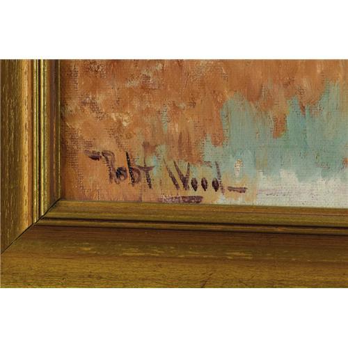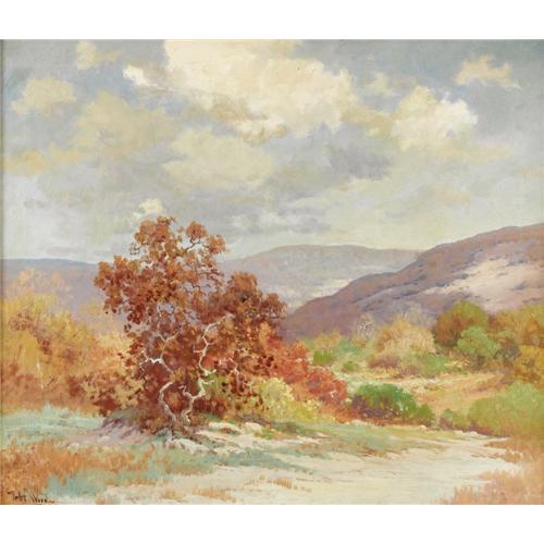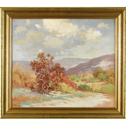 <B>ROBERT WOOD (1889-1979)</B></I><BR>Untitled Hill Country Autumn, early to mid 1930s<BR>Oil on canvas<BR>24in. x 28in.<BR>Signed lower left<BR><BR>As is clearly evidenced in this sale, Texas had a dramatic effect on Robert Wood's art. Upon moving to San Antonio, Robert Wood developed a close friendship with Jose Arpa. Arpa, who's bright sun-filled landscapes earned him the nickname "Sunshine Man," transformed Robert Wood's style and technique. Even more so than his light-filled bluebonnet paintings, this canvas shows the profound effect Jose Arpa had on Robert Wood's painting.<BR><BR>Provenance:<BR>Acquired by descent from the artist by the present owner<BR><BR> <B>Condition Report:</B> Excellent original canvas. No lining. Clouds have been strengthened with over paint. Craquelure has been lightly and delicately (finely) inpainted. Period frame in excellent condition.<BR><BR><b>Shipping:</b> Requires 3rd Party Shipping (<a target="_blank" href="http://www.heritageauctions.com/common/shipping.php">view shipping information</a>)