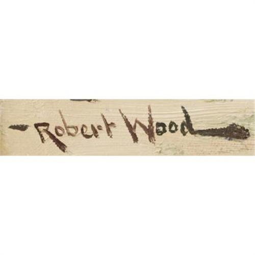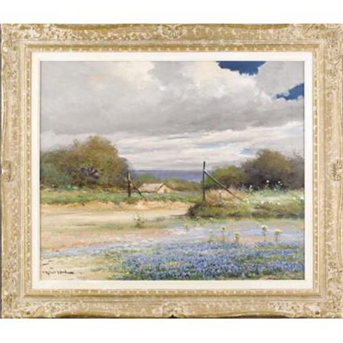 <B>ROBERT WOOD (1889-1979)</B></I><BR><I>Boerne Texas</B></I><BR>Oil on canvas<BR>25 x 30 inches (63.5 x 76.2 cm)<BR>Signed lower left<BR>Titled verso<BR><BR> Painted after Robert Wood left Texas, this painting is a masterpiece of light, color, and composition. Wood is known for dramatic clouds and this painting is an excellent example of that proficiency. The bluebonnets, and yellow and white flowers, are painted with a thick juicy impasto that successfully plays against the less thickly painted sky. Rich and vibrant colors with subtle tonalities are used throughout the painting.<B>Condition Report:</B> Excellent condition. Period frame in excellent condition.<BR><BR><b>Shipping:</b> Requires 3rd Party Shipping (<a target="_blank" href="http://www.heritageauctions.com/common/shipping.php">view shipping information</a>)