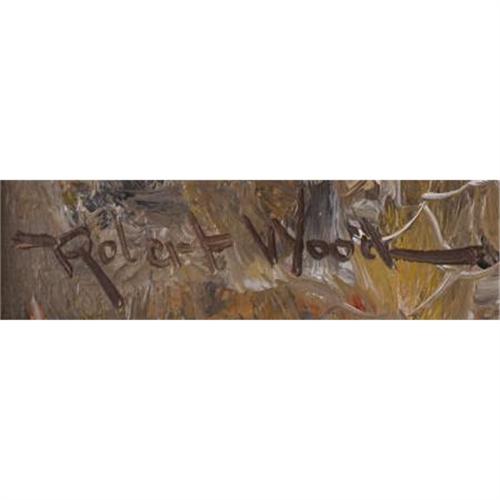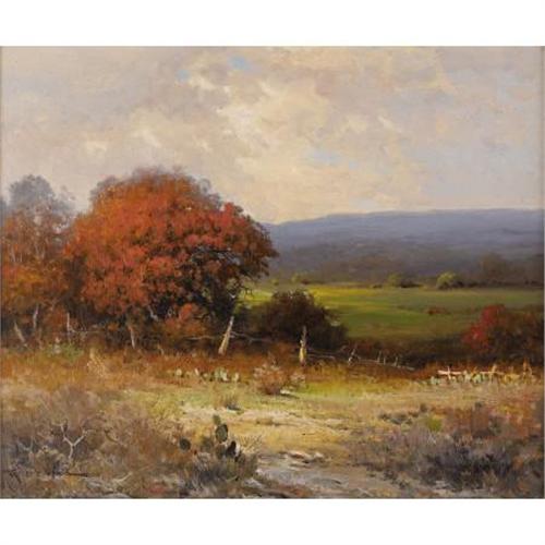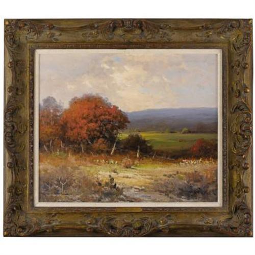 <B>ROBERT WOOD (1889-1979)</B></I><BR><I>Spanish Oak</B></I>, late 1940s to early 1950s<BR>Oil on canvas<BR>20 x 24 inches (50.8 x 61.0 cm)<BR>Signed lower left<BR>Titled verso<BR><BR> Painted a few years after Robert Wood left Texas, <I>Spanish Oak</B></I>, is an exemplary Texas Hill Country autumn landscape. From one of his major dealers, the Sigoloff Gallery in San Antonio, and many devoted Texas collectors, Robert Wood had both ample demand and ample opportunity to continue painting the Texas Hill Country that he obviously loved.<B>Condition Report:</B> Excellent condition. Period frame in excellent condition.<BR><BR><b>Shipping:</b> Requires 3rd Party Shipping (<a target="_blank" href="http://www.heritageauctions.com/common/shipping.php">view shipping information</a>)
