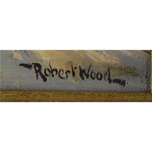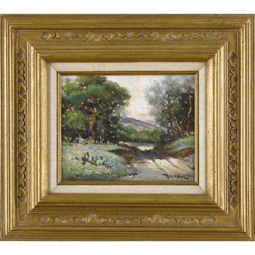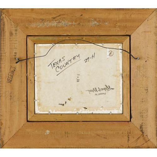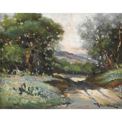 <B>ROBERT WOOD (1889-1979)</B></I><BR><I>Texas Country</B></I><BR>Oil on canvasboard<BR>8in. x 10in.<BR>Signed lower right<BR>Signed and titled verso<BR><BR>From earlier paintings in this auction we can show that even after Robert Wood relocated to California he would periodically return to Texas. He had two daughters in San Antonio and had grown to love Texas and its scenery. This later Robert Wood painting is a fabulous impressionist rendition of bluebonnets, Indian paintbrushes, and prickly pear cactus, alongside a winding caliche road.<BR><BR>Provenance:<BR>Purchased from a California Gallery in 1978 by the present owner<BR><BR> <B>Condition Report:</B> Excellent condition. Period frame in excellent condition.<BR><BR><b>Shipping:</b> Requires 3rd Party Shipping (<a target="_blank" href="http://www.heritageauctions.com/common/shipping.php">view shipping information</a>)