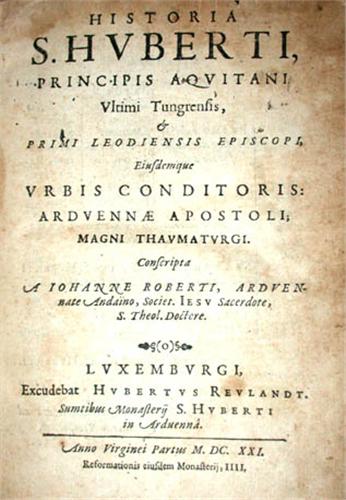 Seule édition de cette histoire du premier évêque de Liège, patron des Ardennes et des chasseurs, due au jésuite luxembourgeois Jean Roberti (Saint-Hubert 1569-1651 Namur), professeur à Douai, Trèves et Mayence.