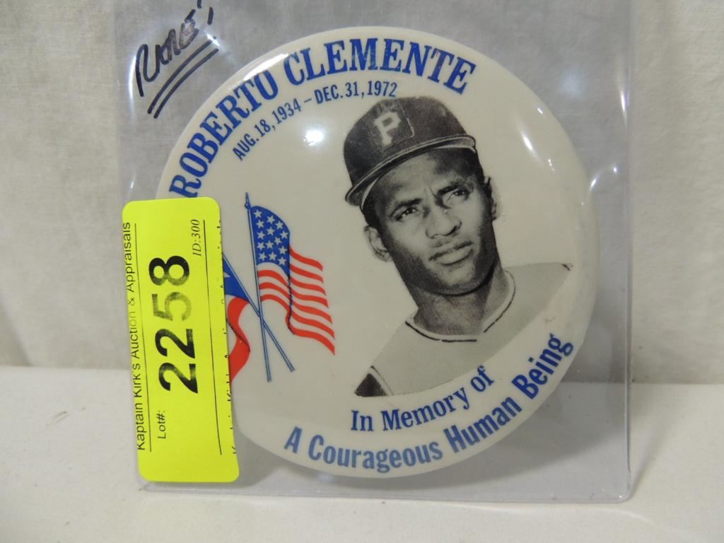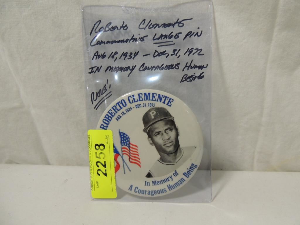 ROBERTO CLEMENTE COMMEMORATIVE LARGER PIN AUGUST 18, 1934-DECEMBER 31, 1972 IN MEMORY OF COURAGEOUS HUMAN BEING. RARE AS SHOWN SEE PHOTO FOR MORE DETAILS.