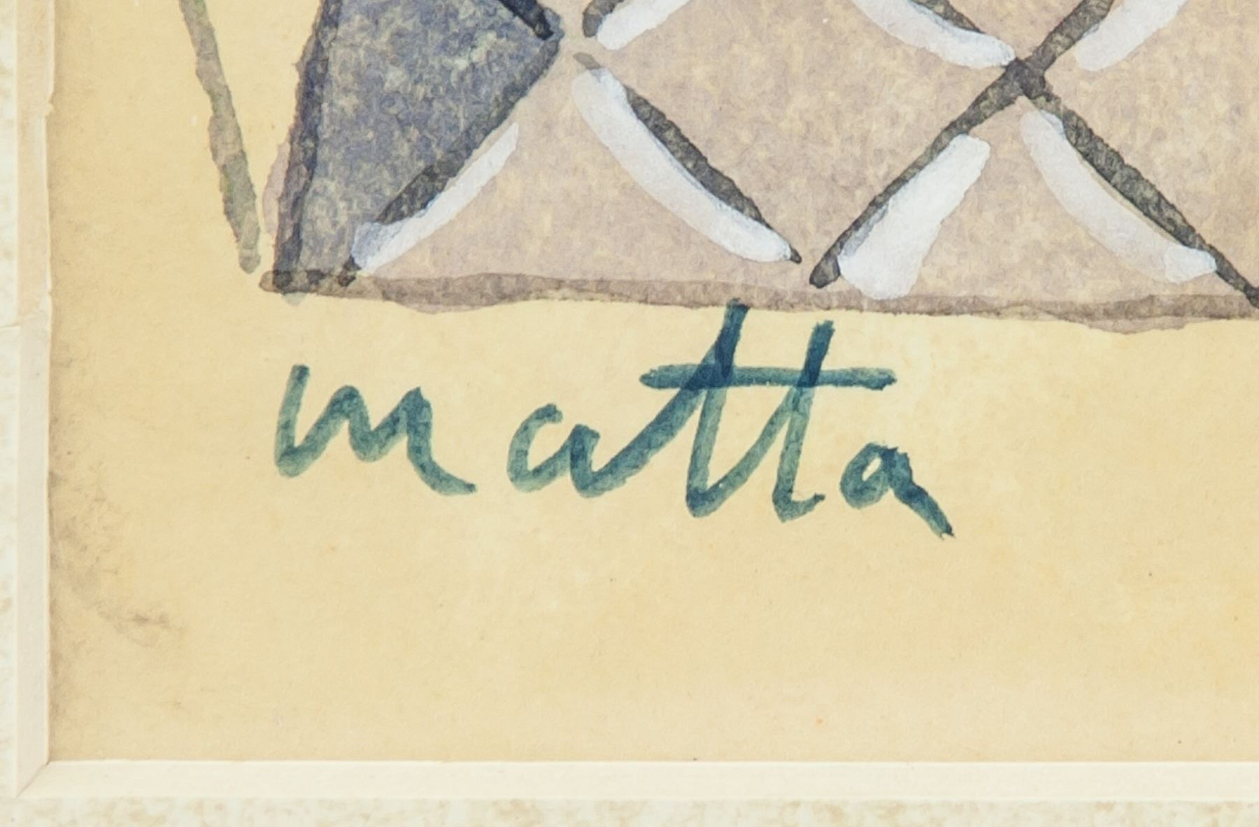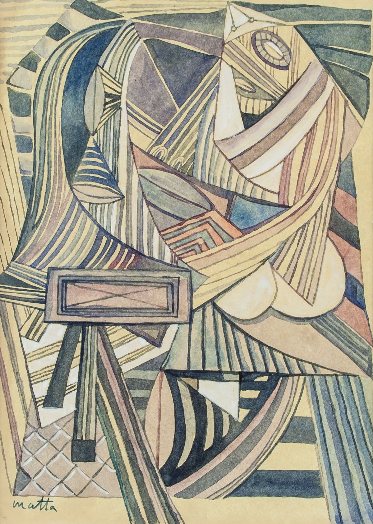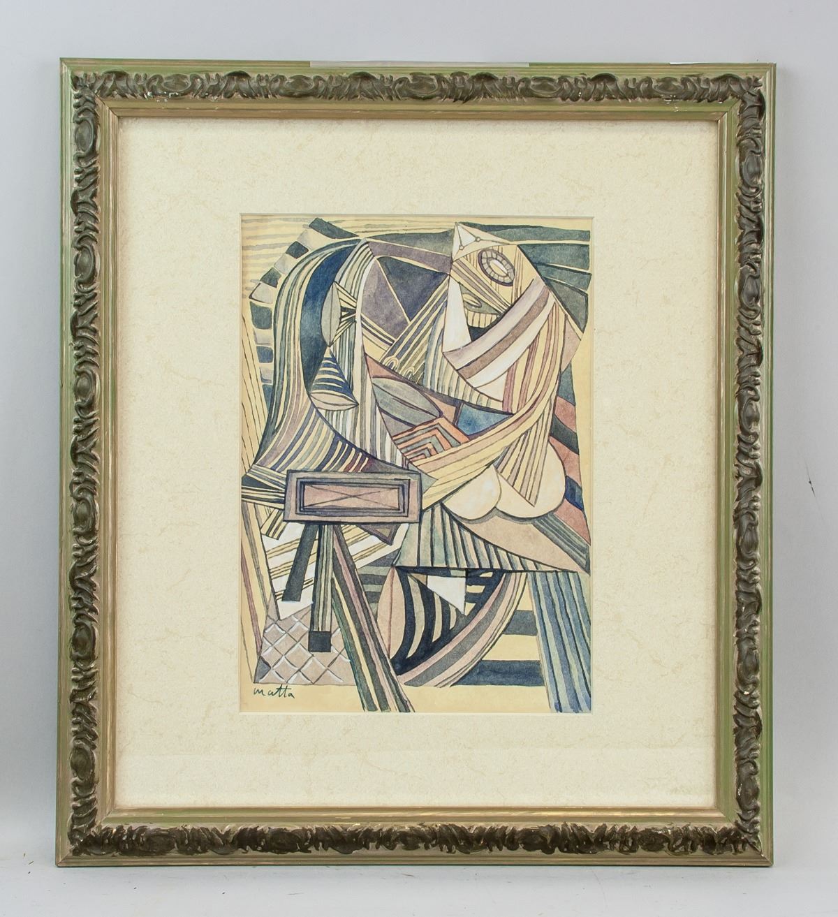 Watercolor on paper, framed. Featuring a surrealist abstract expressionist composition. Signed and attr. Roberto Matta (Chilean, 1911-2002) on the lower left corner. Picture size: 28 x 20 cm (11 x 7.9 inches), frame size: 46.5 x 41.5 cm (18.3 x 16.3 inches). Roberto Matta was a Chilean-born artist known for his unique blending of Surrealism with Abstract Expressionism. Like his friend Arshile Gorky, Matta’s otherworldly paintings and prints explored the unconscious through methods of Surrealist automatism. With fluid brushstrokes of rich color the artist described nebulous spaces inhabited by floating organic and architectonic forms, as seen in the hallmark work Les Roses sont belles (1951). “I am interested only in the unknown and I work for my own astonishment,” he once declared. Born Roberto Sebastián Antonio Matta Echaurran on November 11, 1911 in Santiago, Chile, he graduated with a degree in architecture from the Catholic University of Santiago in 1932 before moving to Paris to work in the studio of Le Corbusier. While in Europe, he travelled to Madrid where he was introduced to the famed Surrealist Salvador Dalí. It was Dalí who encouraged Matta to show his architectural drawings to André Breton and pursue a career in art. Now an accepted member of the Surrealist group, Matta settled in New York in 1938, began oil painting, and befriended American artists while maintaining ties with European friends like Yves Tanguy. In 1948, after the suicide of his friend Gorky, many of his American peers blamed Matta for the death, as he had slept his Gorky’s wife shortly before the tragic event. Ostracized, the artist returned to Europe, spending much of the rest of his life between Paris and Rome. He died on November 23, 2002 in Civitavecchia, Italy at the age of 91. Matta’s works are presently held in the collections of the Tate Gallery in London, The Museum of Modern Art in New York, the Walker Art Center in Minneapolis, and the Peggy Guggenheim Collection in Venice. PROVENANCE: Southern Ontario estate