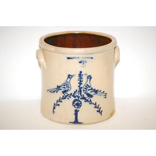 ROBERTS DECORATED 3 GAL. STONEWARE CROCK W/ DOUBLE SINGING BIRDS IN TREE DECORATION-SIGNED ROBERTS BINGHAMTON NY (10 1/2" T X 10 1/2" W) - PROFESSIONALLY RESTORED