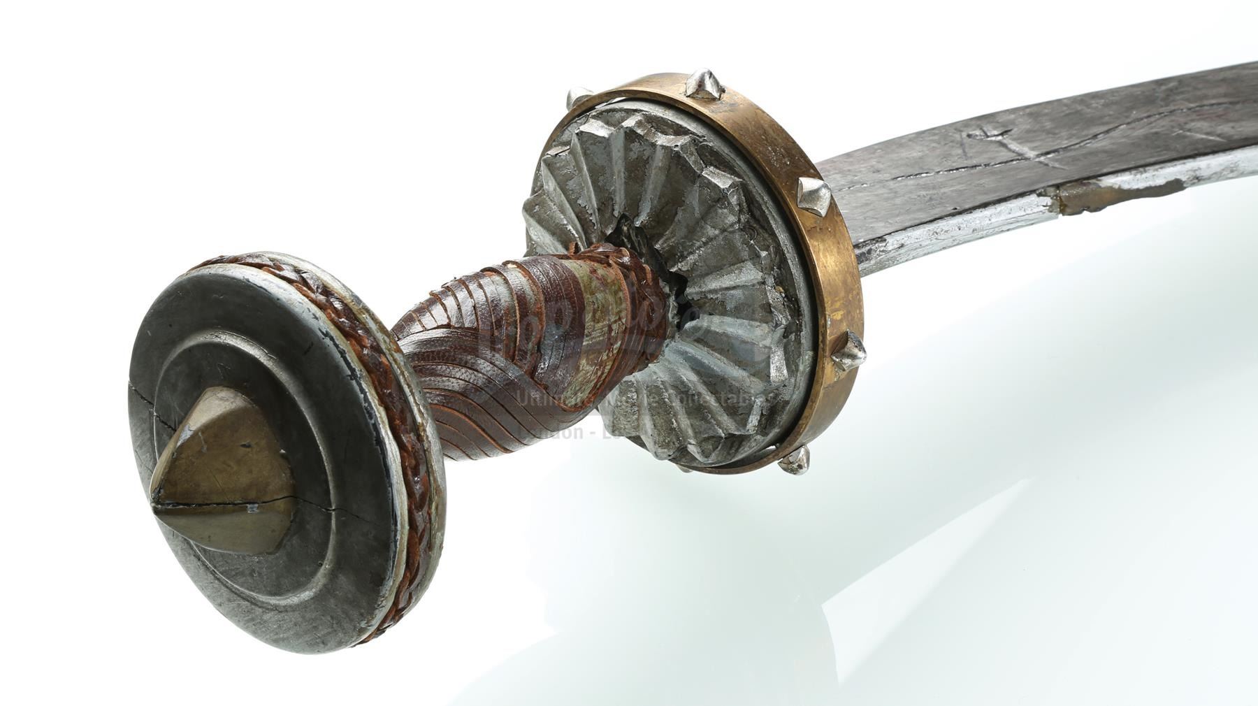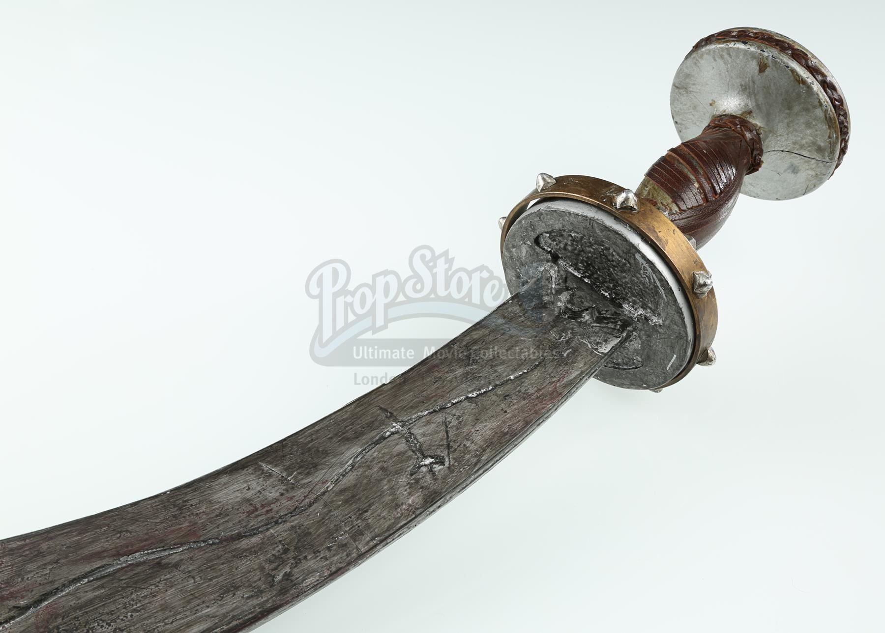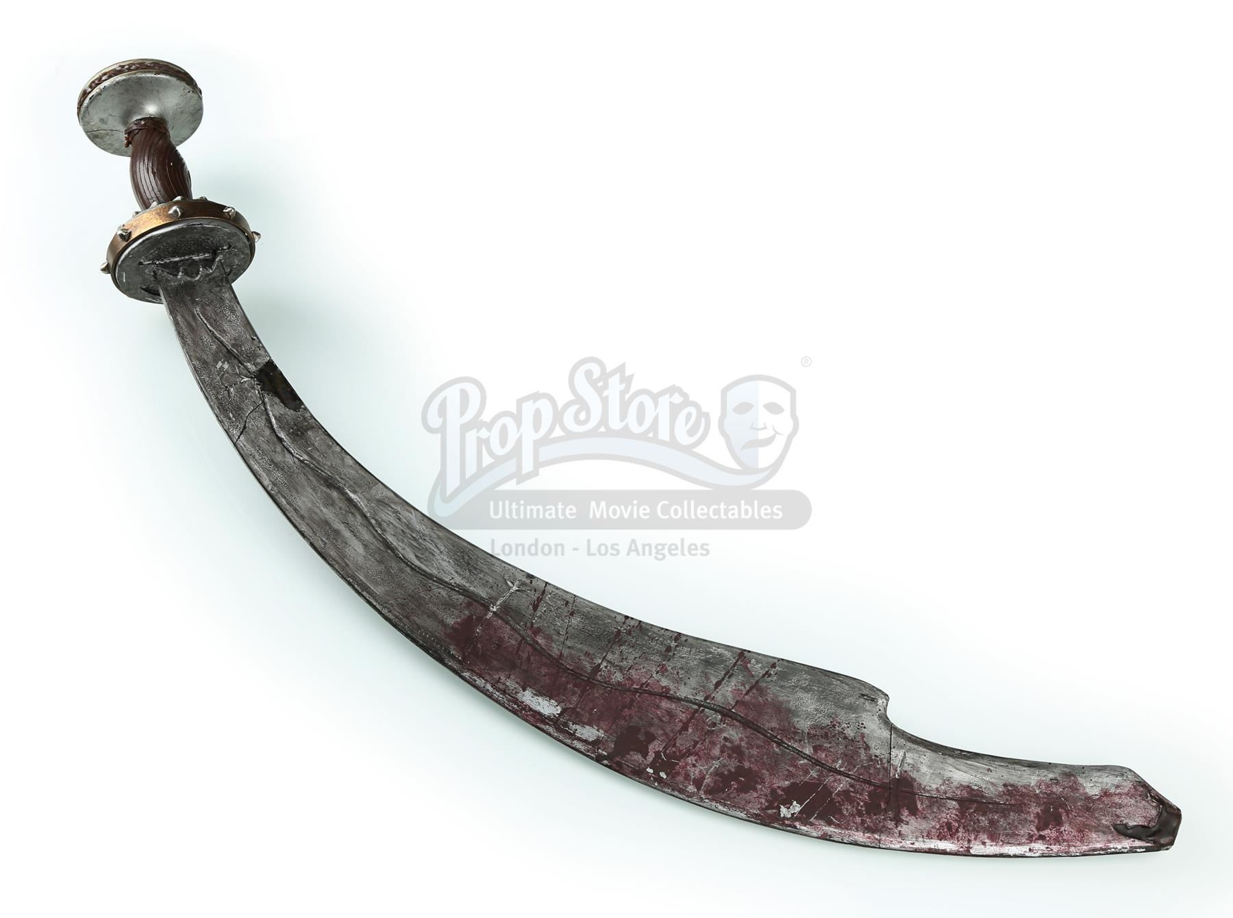 The scimitar is constructed from resin, with brown leather strips wrapped around the grip and a round brass-studded guard. It has been finished with grey and faux-gold paint and textured with red paint to simulate blood. The long curved blade displays simple decorative etching and the pommel is decorated with brown leather plaiting. Distressed from production use, the weapon shows repairs to the blade that were made on-set using resin and painted black, with cracks, paint chips, a missing tip and worn off sections of leather. Dimensions: 96 cm x 28 cm x 13 cm (37 3/4'' x 11'' x 5'')