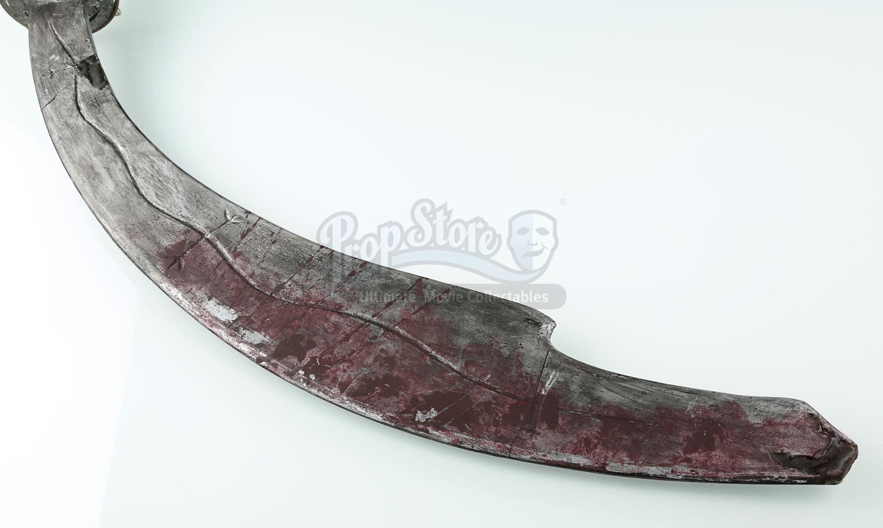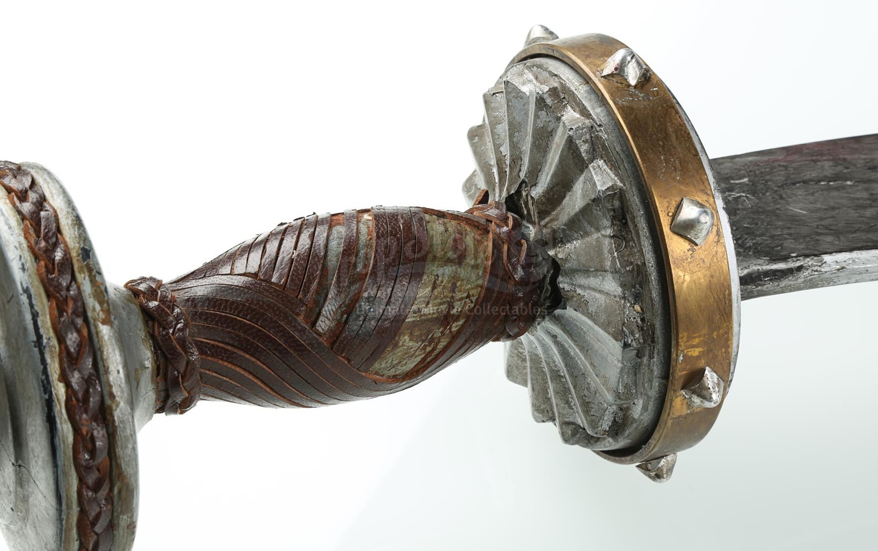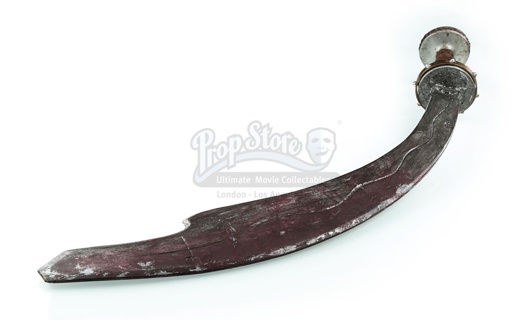 The scimitar is constructed from resin, with brown leather strips wrapped around the grip and a round brass-studded guard. It has been finished with grey and faux-gold paint and textured with red paint to simulate blood. The long curved blade displays simple decorative etching and the pommel is decorated with brown leather plaiting. Distressed from production use, the weapon shows repairs to the blade that were made on-set using resin and painted black, with cracks, paint chips, a missing tip and worn off sections of leather. Dimensions: 96 cm x 28 cm x 13 cm (37 3/4'' x 11'' x 5'')