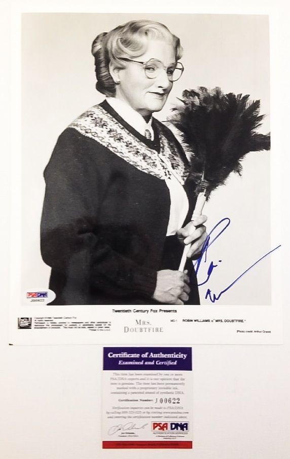 ROBIN WILLIAMS SIGNED PHOTO MEASURING 8X10 FROM THE 1993 AMERICAN COMEDY FILM MRS DOUBTFIRE STARRING IN AS WELL AS CO-PRODUCING INCLUDES A CERTIFICATE OF AUTHENTICITY FROM PSA/DNA.