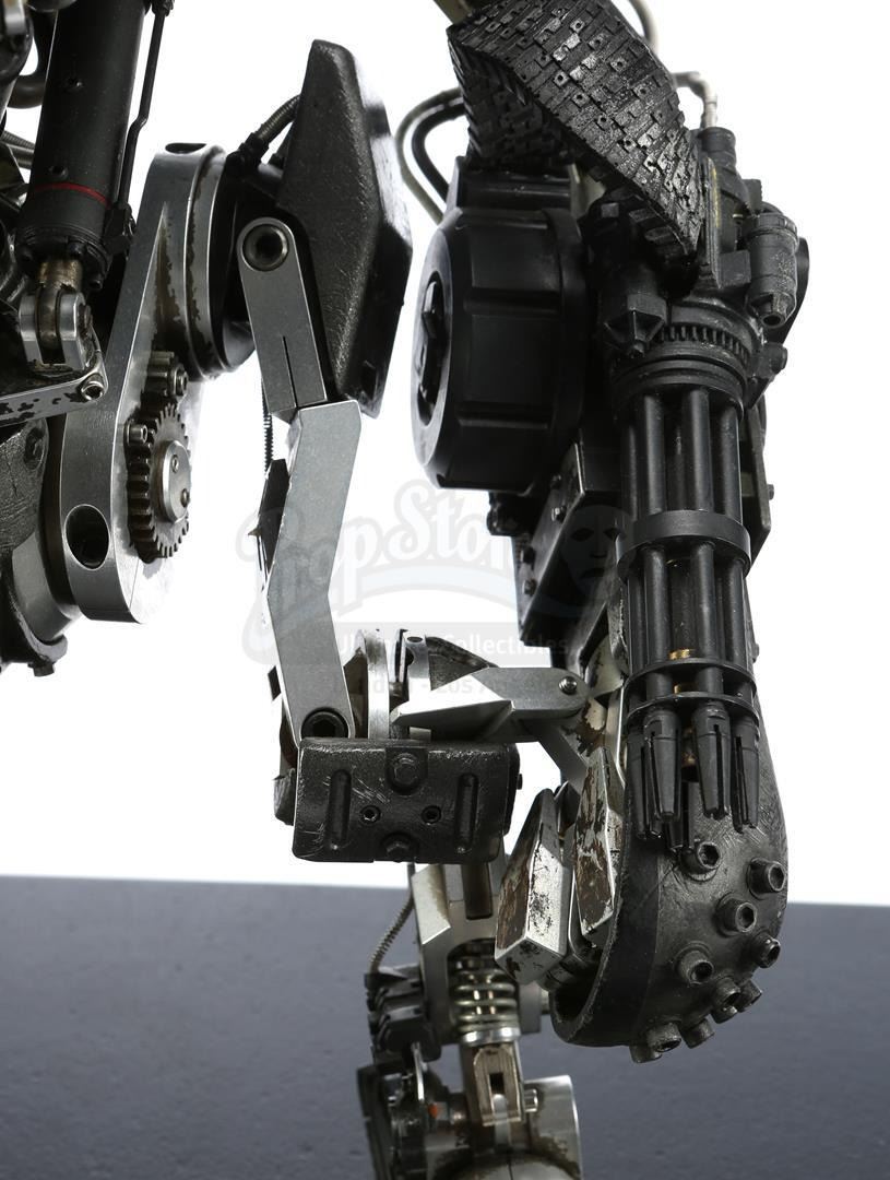 The stop-motion puppet is made primarily of resin over an intricate, machined stop-motion armature, with the body painted in shades of metallic silvertone, grey, and black to give the appearance of being entirely made of metal. A weathered finish, with scuffs and black staining, was applied by production to simulate battle-damage. Finer details include small cables and wires, cylindrical pistons, a yellow and black ionizing radiation hazard symbol, and an arm-mounted minigun with an ammunition belt. While most stop-motion puppets must hide a stop-motion armature beneath an exterior character layer, this puppet is unique in that (as it portrays a mechanical being) it incorporates the stop-motion armature right into the visible mechanics of the robot. The highly detailed puppet comes attached to a black-painted wooden base with a clear acrylic cover. The lot is in excellent overall condition with minimal wear from production and age, including some paint chipping. Includes a letter of authenticity from Phil Tippett. Dimensions (with cover): 53.5 cm x 32 cm x 48.5 cm (21" x 12 1/2" x 19")