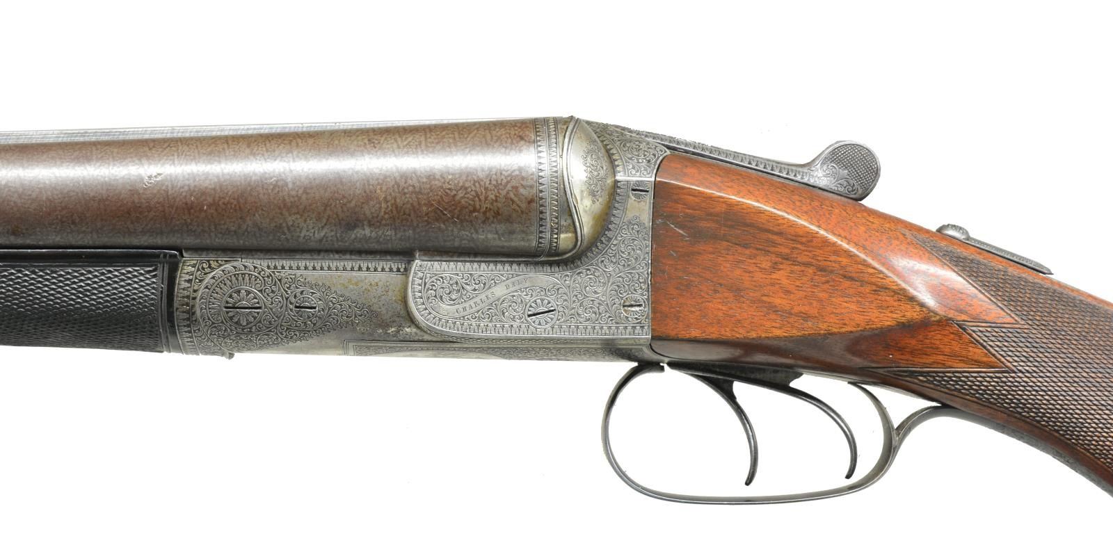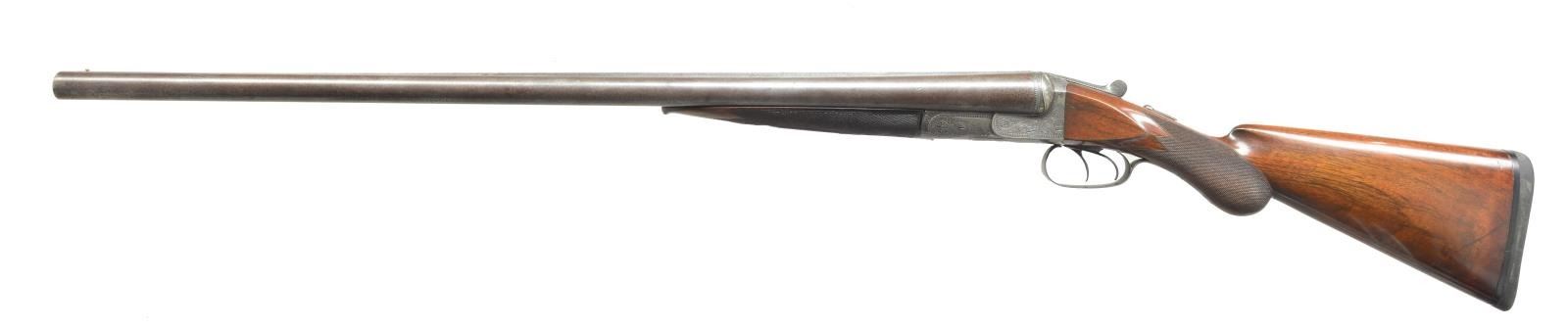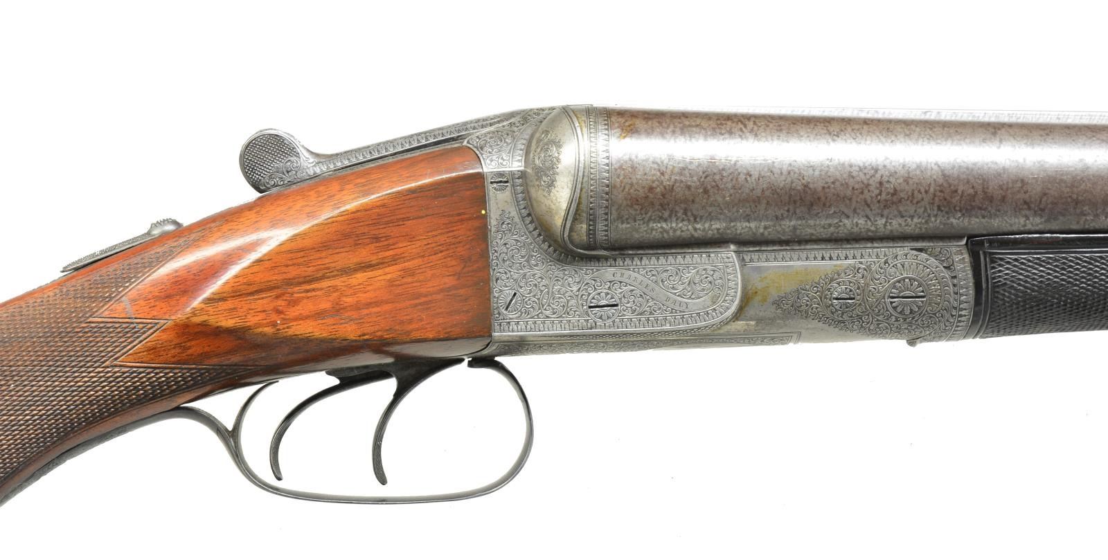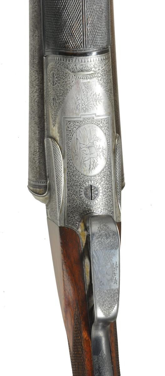SHOTGUN BY H.A. LINDNER. Cal. 10 Ga. (2 7/8"). S# 2929. 30" Damascus bbls. of a pattern that resembles "Bernard" are engraved "CHARLES DALY EXTRA FINE DAMASCUS BARRELS. DIAMOND QUALITY" on unmatted portion of concave game rib. Bbl. flats are stamped w/ S# & bottoms of bbls. w/ crowned crossed pistol logos (Lindner). Case hardened boxlock action stamped w/ Anson Deely patent use number "411" on breech face features automatic safety ("SAFE" inlaid in gold) & dbl. triggers w/ checkered finger blades. Action is nicely filed & engraved w/ 80% coverage exceptionally well cut & beautifully shaded varying sized open scroll w/in geometric borders. "CHARLES DALY" is on scrolled riband on each side. This fine scroll surrounds game scenes on bottom of action w/ 2 game birds sheltered under a pine tree at front w/ standing roebuck on trigger plate. Scroll engraved trigger guard bow portrays a pointing pointer, S# is on tang. Replacement rnd. knob buttstock of lightly figured American walnut measures 14 1/2" over black "Pachmayr" pad. Point pattern checkering is at grip. Original splinter forend w/ inlet horn tip has Deely release. MEASUREMENTS: BARRELS: bore diameter: R .774, L .780. Restriction: R .025 (MOD), L .025 (MOD). Min. Wall Thickness: R . 055, L .052. STOCK: LOP: 14 1/2". DAC: 1 11/16". DAH: 2 5/8". Cast: Neutral. WEIGHT: 10 lbs. 7 oz. CONDITION: very good as partially refurbished. Bbls. retaining most of their original Damascus finish. Action w/ traces of original case color is mostly silver gray, transitioning to brown around bottom. Replacement buttstock retains nearly all of its oil finish. Trigger guard reblued. Bores are bright & shiny, left bbl. w/ very slight 6" long bulge visible on outside 13" from breech end (cleaned up on the inside). Given the wall thickness of these bbls., this should not be a safety issue. (01-18509/MGM90). ANTIQUE. $2,000-3,000.