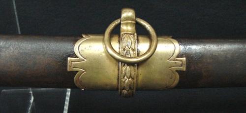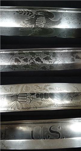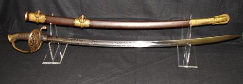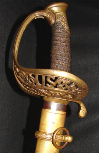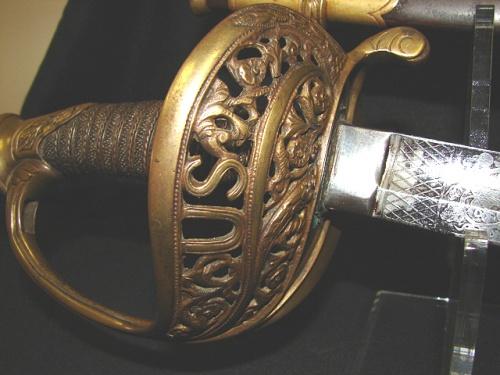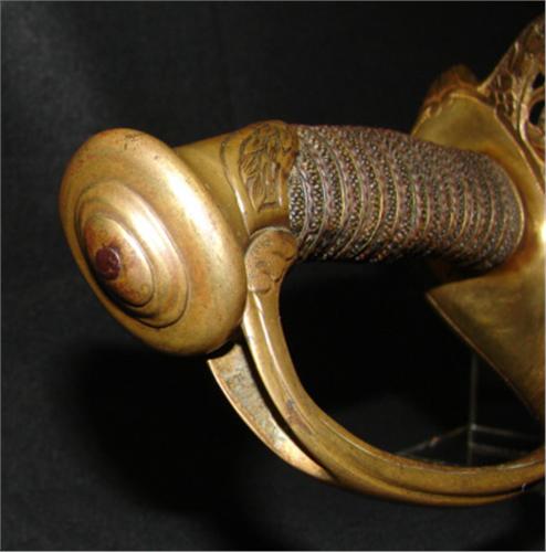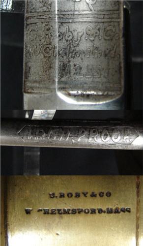 RARE C. ROBY & CO. MODEL 1860 CAVALRY OFFICER’S SABER & SCABBARD. Has rare & ornate Staff & Field hilt with half-basket guard with two branches. Pierced floral designs and the letters “US” fill the spaces between the branches. Has wooden grip covered with fish skin and wrapped with twisted gilt wire. Blade is ornately decorated with floral motifs and eagle and is uniquely engraved “Union/1862”. Saber is marked at ricasso and scabbard is marked near throat “C. Roby & Co., W. Chelmsford, Mass.” Side of blade is marked “IRON-PROOF”. Has steel scabbard with brass mounts. Minor denting at tip of scabbard. A similar saber is depicted on Page 322 of Civil War Cavalry and Artillery Sabers by John H. Thillmann. Total length: 37 ¼”, Blade length: 31 ¾”