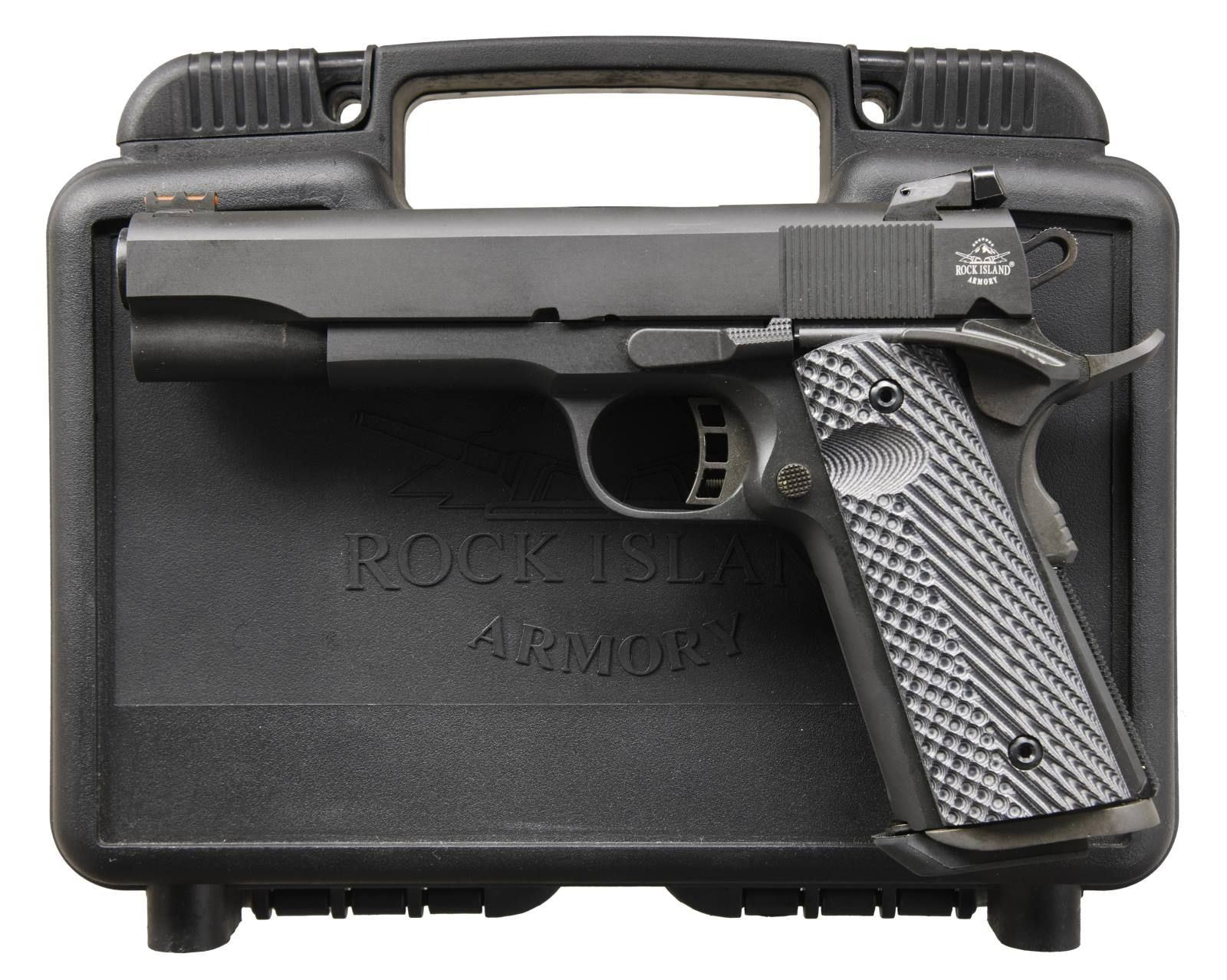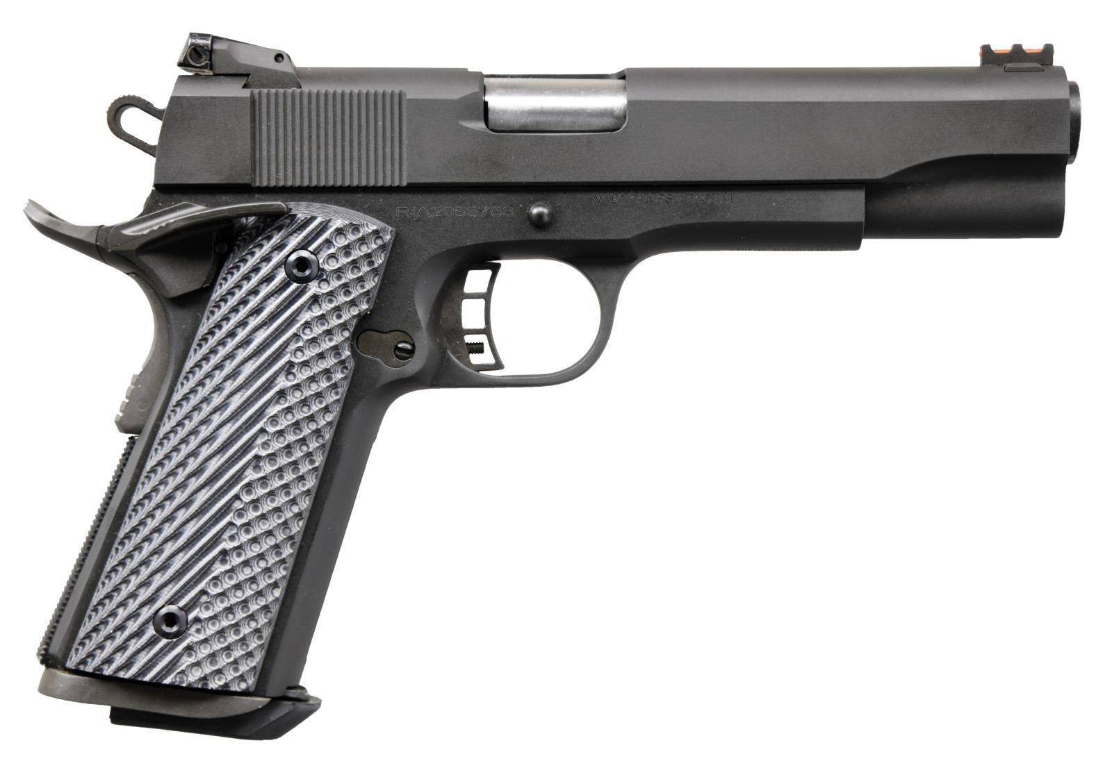 Cal. 10mm. S# RIA2053783. Bbl. 5". Single stack 1911 style pistol in 10mm. Fiber optic front sight. Adjustable white dot rear sight. Ambidextrous safety. Extended beavertail grip safety. Parkerized finish. G10 grips. MAGS: 1-8 rd. unmarked 2-8 rd. Wilson Combat. Total of 3 mags. UNATTACHED ACCESSORIES: factory hard case matching numbered to gun w/ manual & fired case. CONDITION: all aspects very good plus or better w/ light handling & operational wear. (23-2715/MJC). MODERN. $300-450.