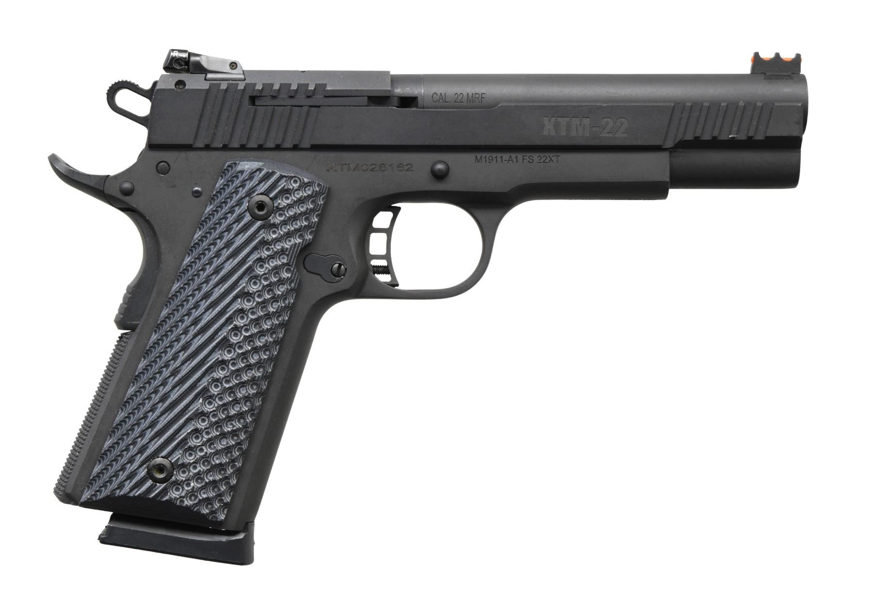PISTOL. Cal. 22 WMR. S# XTM026162. Bbl. 5". Fiber optic front sight. Adjustable white dot LPA rear sight. Parkerized finish. Extended beavertail grip safety. G10 grips. MAGS: one 14 rd. UNATTACHED ACCESSORIES: matching-numbered factory hardcase with cable lock and manual. CONDITION: all aspects rate very good or better, with the metal showing some light scratches and edge wear. PROVENANCE: from the ex-collection of Gun Sport Ltd., owned by Jon R. Thomas. (24-3785/MJC). MODERN. $450-600.