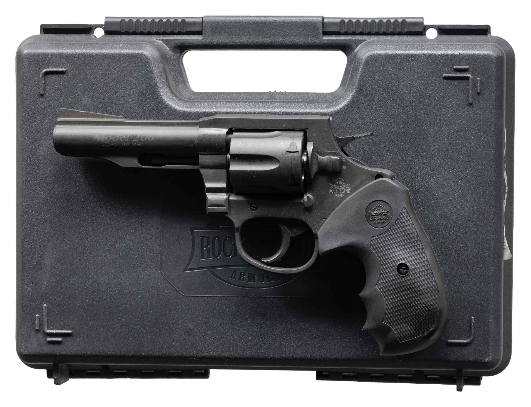 Cal. 38 Spl. S# RIA2418627. Bbl. 4". Ramped blade front sight. Fixed rear sight. Matte gray finish. Checkered black rubber grips with RIA monograms. UNATTACHED ACCESSORIES: matching numbered factory hardcase with packaging. CONDITION: grips & metal show light handling & usage marks. Action functions properly when hand cycled. Very good plus bore with strong rifling. (25-5289/MJC). MODERN. $300-400.