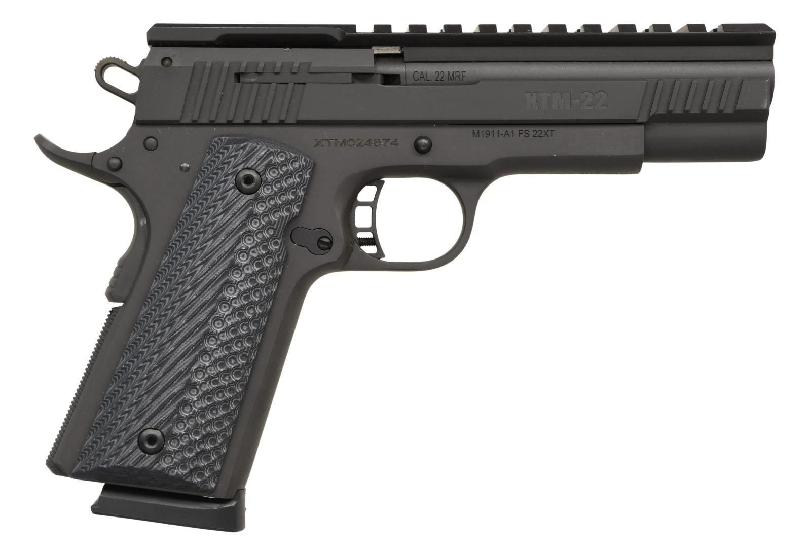Cal. 22 Mag. S# XTM024874. Bbl. 4 1/2". No iron sights present. Slide mounted picatinny rail. Front & rear slide serrations. Extended beavertail grip safety. Matte gray finish. G10 grips. MAGS: 1-14 rd. factory. UNATTACHED ACCESSORIES: w/box. CONDITION: all aspects near excellent. PROVENANCE: The Collection of Gun Sport Ltd owned by Jon R. Thomas. (23-4228/MJC). MODERN. $500-800.