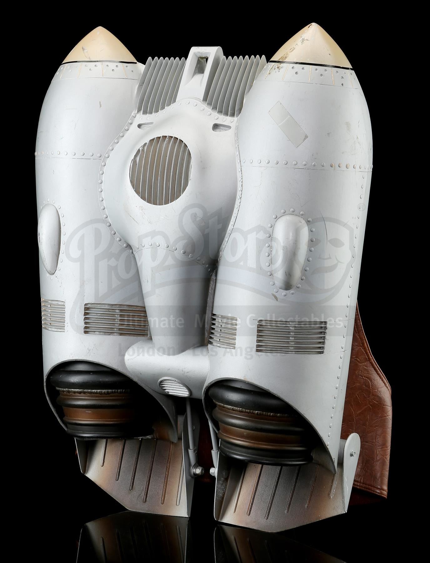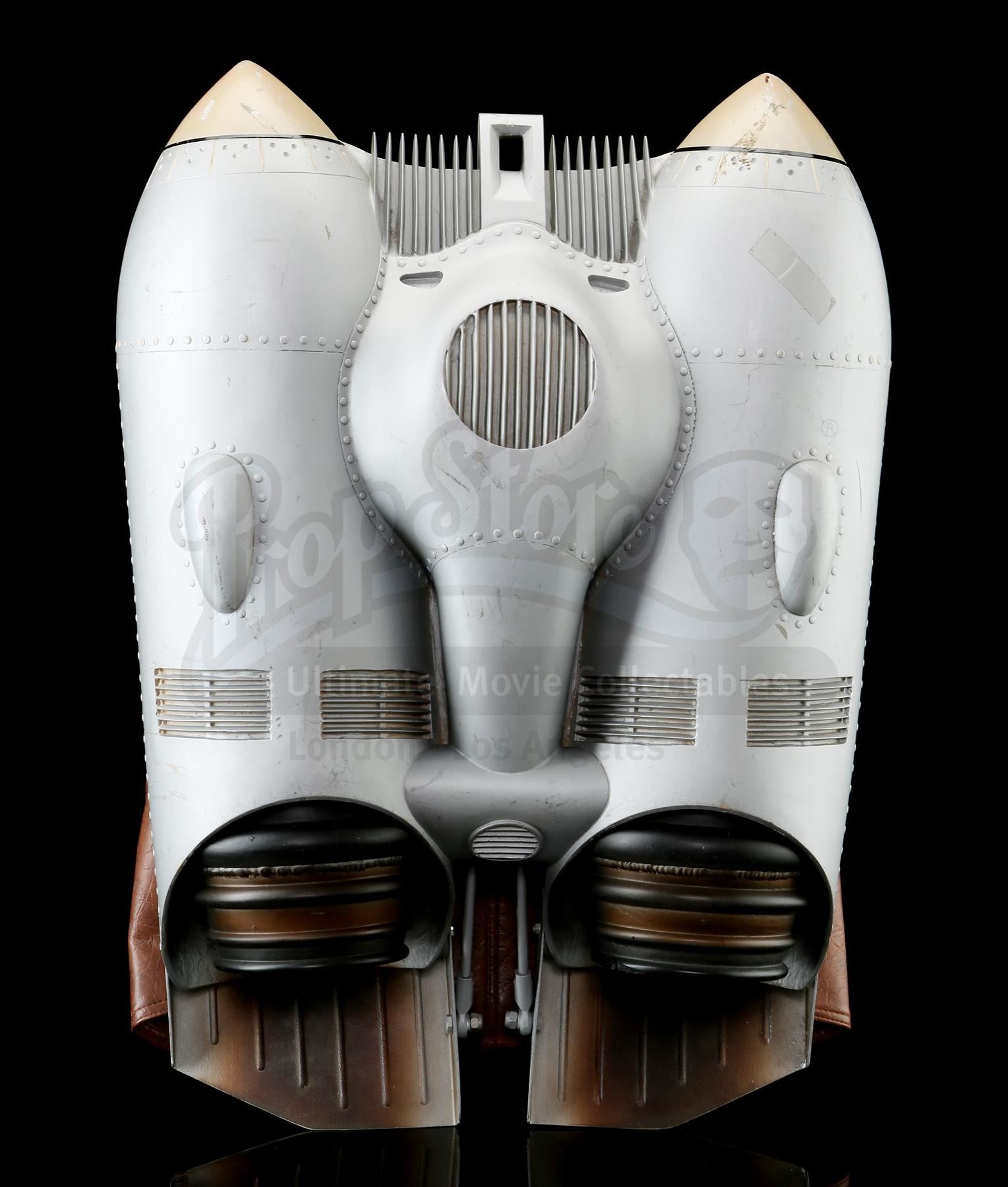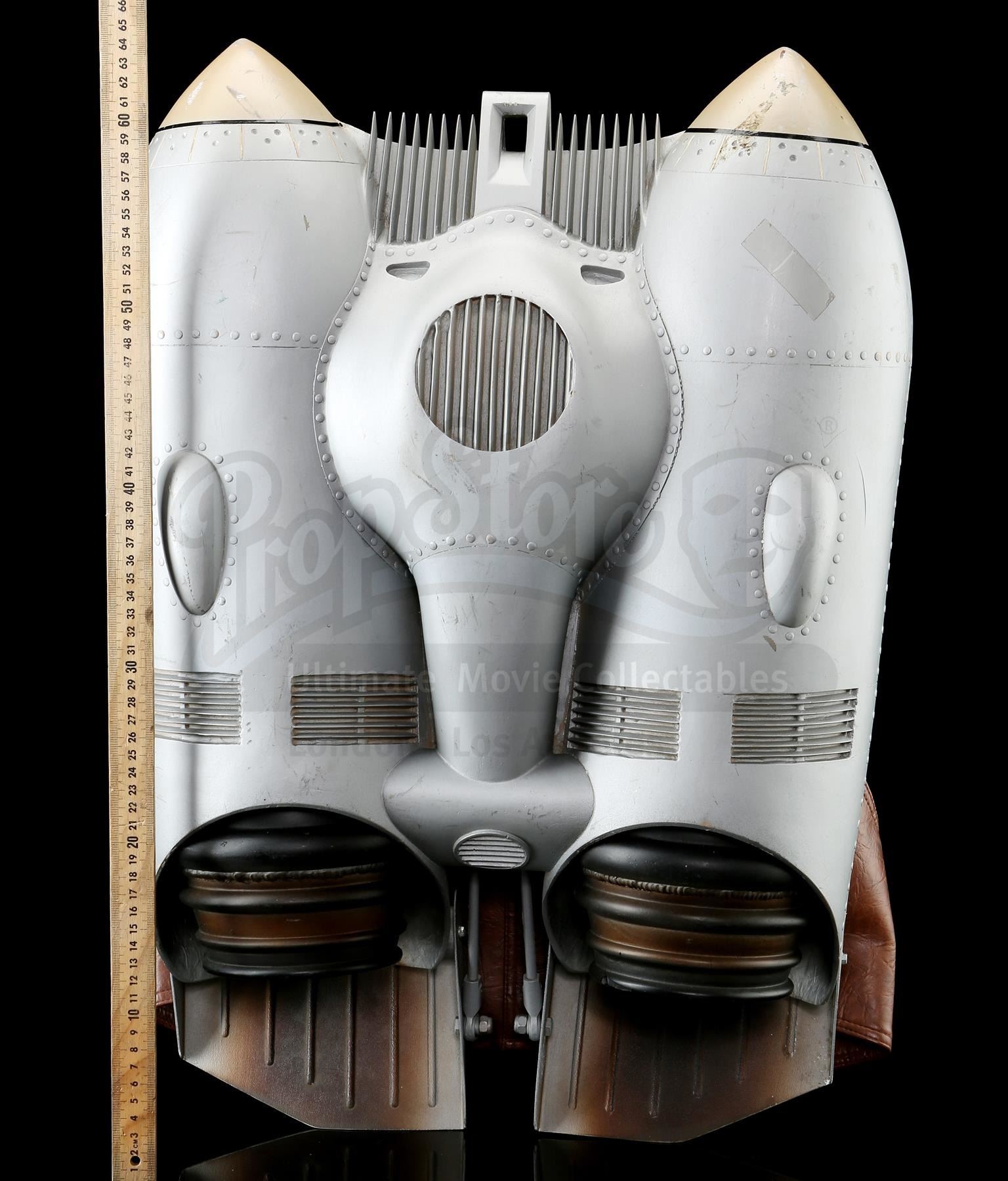 This silver-coloured resin jetpack features twin black-and-brown thrusters and several metal elements, and is mounted on a reinforced brown leather backpack housing via Velcro attachments on the straps. It was made from the original moulds used in the film, and used as part of an international promotional tour during the film's release, which featured performers wearing the Rocketeer costume. This jetpack exhibits small signs of wear throughout, including scuffing and paint chipping, as well as a small piece missing from the rim of one of the thrusters, and an attached piece of tape. Dimensions: 63.5 cm x 45.75 cm x 20.25 cm (25 1/2" x 18" x 8")