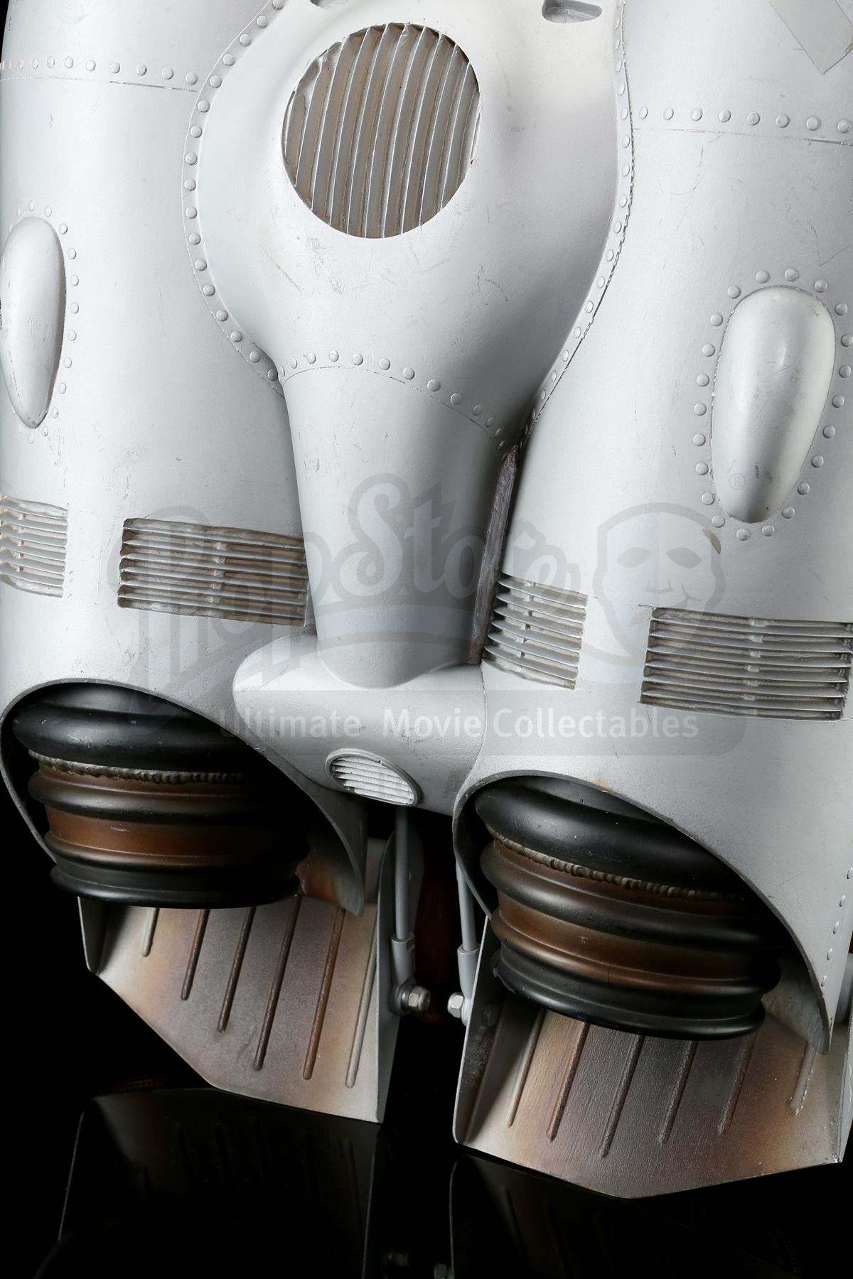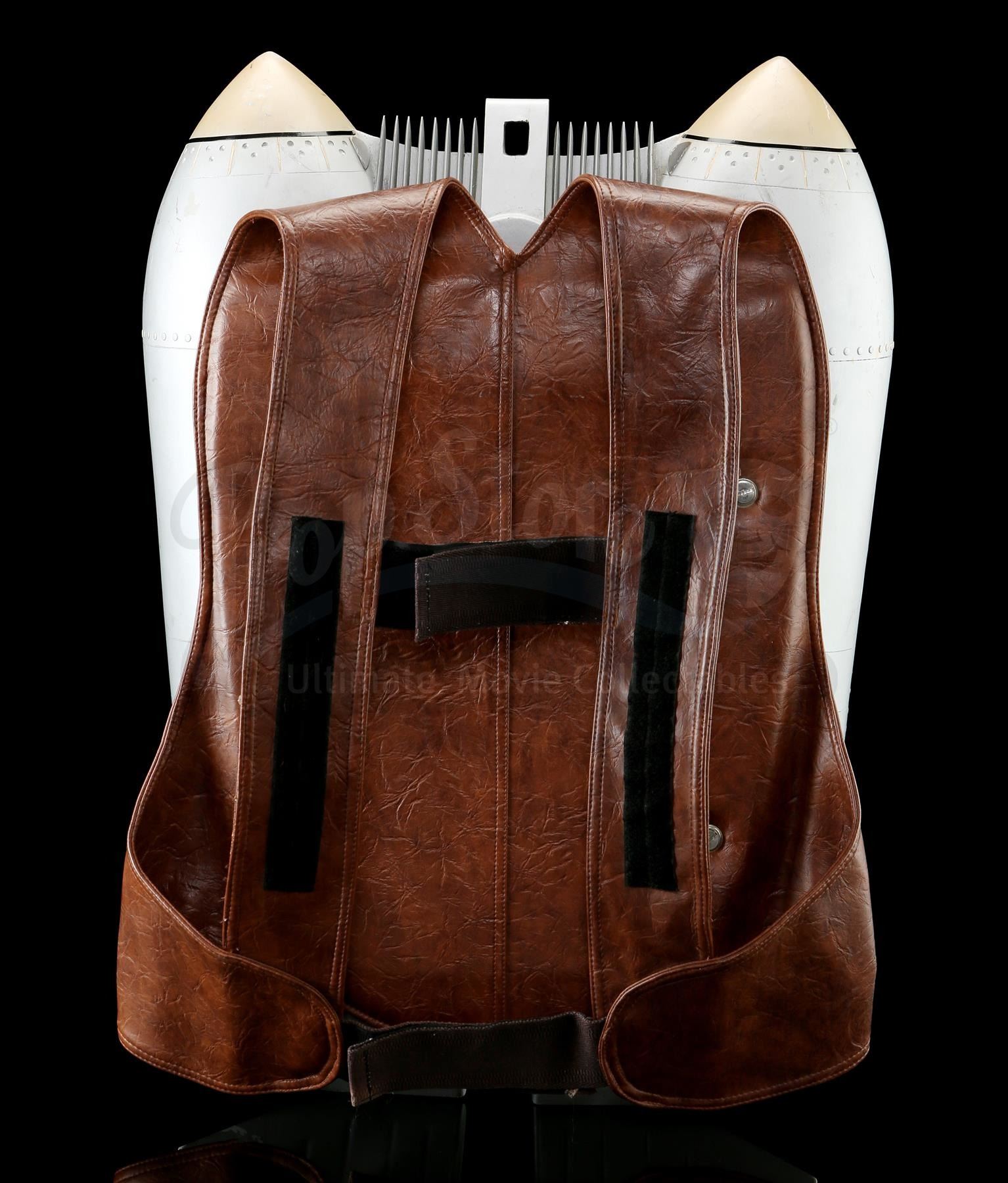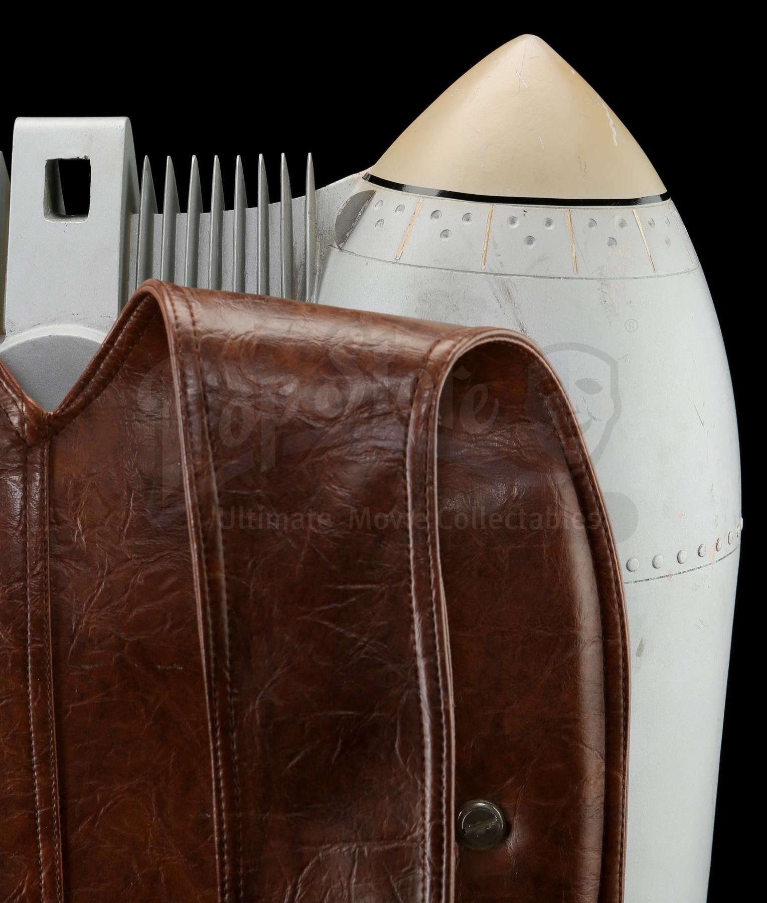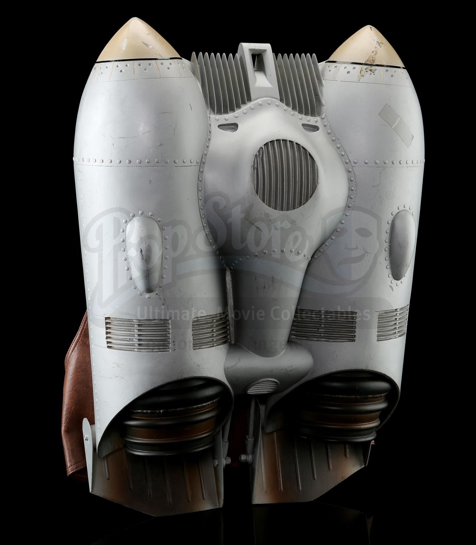 This silver-coloured resin jetpack features twin black-and-brown thrusters and several metal elements, and is mounted on a reinforced brown leather backpack housing via Velcro attachments on the straps. It was made from the original moulds used in the film, and used as part of an international promotional tour during the film's release, which featured performers wearing the Rocketeer costume. This jetpack exhibits small signs of wear throughout, including scuffing and paint chipping, as well as a small piece missing from the rim of one of the thrusters, and an attached piece of tape. Dimensions: 63.5 cm x 45.75 cm x 20.25 cm (25 1/2" x 18" x 8")