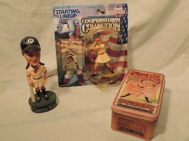 INCLUDES DOTTIE KEY SPECIAL ISSUE BOBBLE HEAD, PEPPER DAVIS STARTING LINEUP FIGURE, AND ROCKFORD PEACHES COLLECTOR TIN. ALL FOR ONE MONEY.