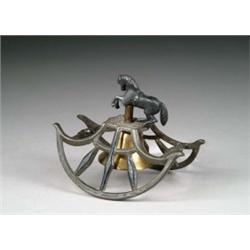 ROCKING BELL TOY. Manufactured by The Gong Bell Co. This bell toy features a finely cast horse (lead) atop a delicately cast base of iron. The horse is actually standing on a United States shield! Probably one of the first bell toys Gong Bell manufactured (#14 in catalog). SIZE: 4 1/2". CONDITION: Near mint condition (including black highlighting to base). JL 1-4119-1144 (300-500)