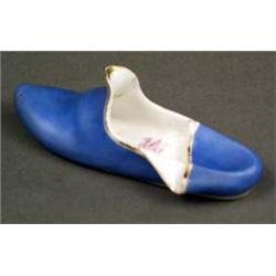ROCKINGHAM - A miniature Rockingham slipper A miniature Rockingham slipper, coloured in azure blue, gilt line border, 4in long, griffin mark in puce and C12 in red, c.1830-42 (slight chipping)