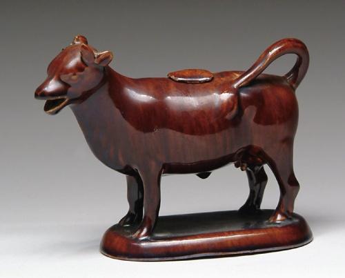 ROCKINGHAM TYPE COW FIGURAL CREAMER. Brown-glaze pottery cow on base complete with small removable lid in the back of the cow. SIZE: 5-1/2in. h. CONDITION: Horns and ears chipped. 9-26405