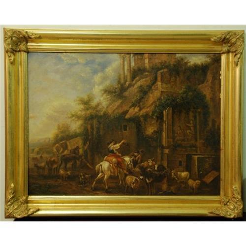DESCRIPTION: ROCKY LANDSCAPE WITH ANITQUE RUINS. AFTER NICOLAES BERCHEM. This extraordinary painting is a delicate and perfect reinterpretation of the homonymous painting by Nicolaes Berchem. A painting that recalls Italian painting, Italian landscape ad atmosphere. In fact, while in Italy, Berchem made many drawings of the landscape of the Roman Campagna, its cattle and peasants. The artist, just like the Great Master, has interpreted the Italian landscape and the life of its peasants in an idyllic manner, emphasizing its timeless continuity by the inclusion of antique monuments. These buildings cannot be identified, as they are only loosely modelled on actual ruins. He uses a bright, highly-coloured palette and applies the paint in short, stabbing brush strokes. We are glad to show you a delicate and perfect proof of art, unobtainable and precious furnishing element.