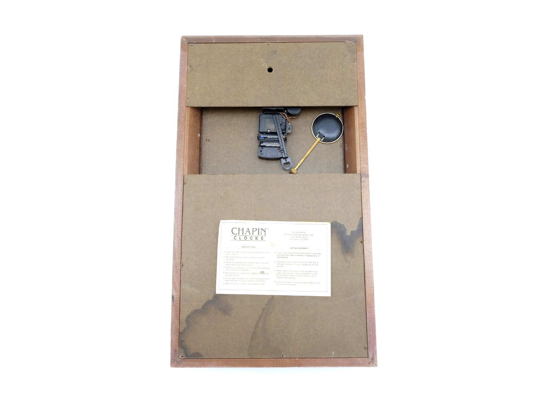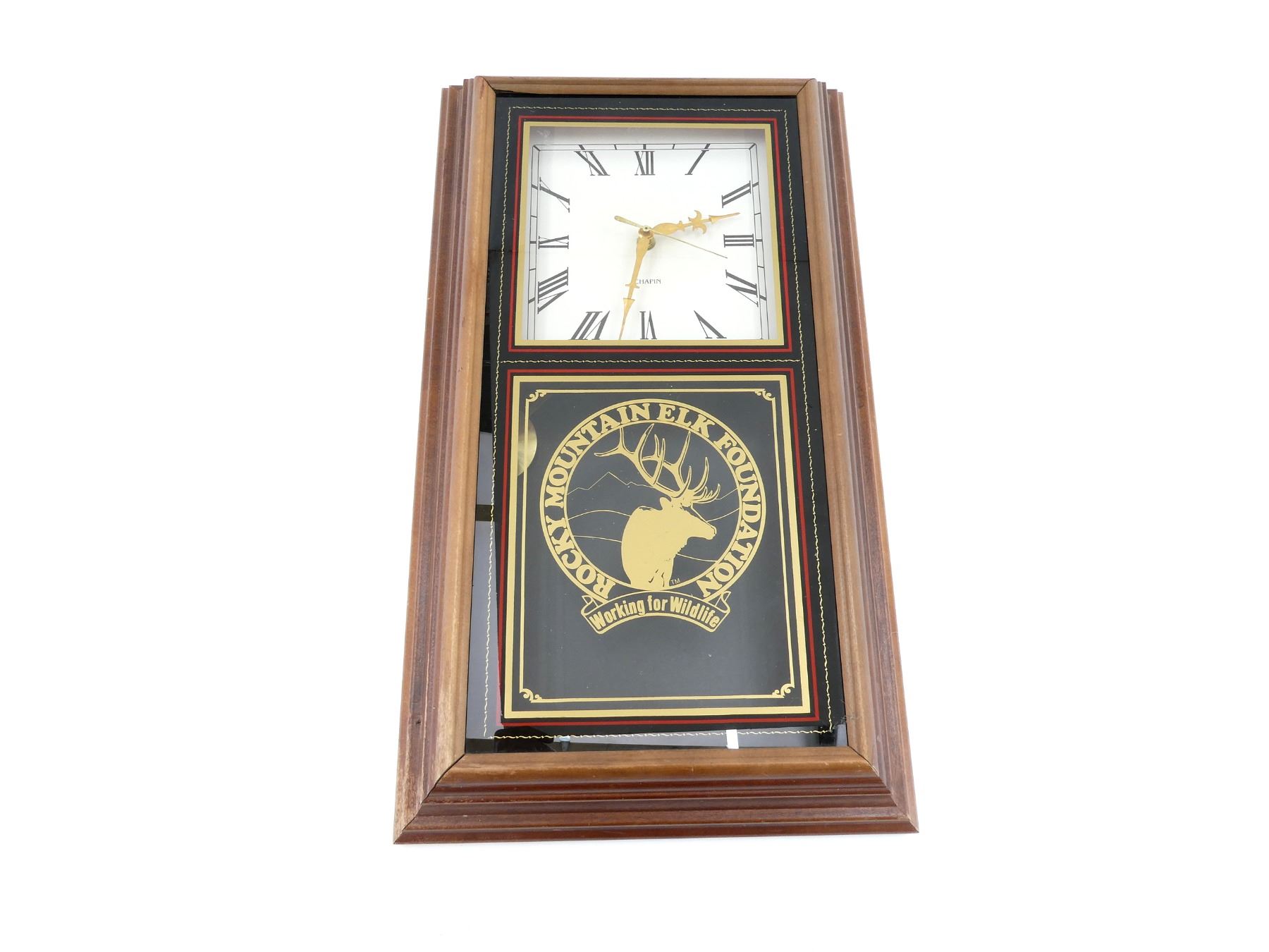 (1) FRAMED CLOCK, UNDER GLASS, MARKED: "ROCKY MOUNTAIN ELK FOUNDATION, WORKING FOR WILDLIFE", APPEARS TO WORK, NOT FULLY TESTED, WOODEN FRAME, APPROX. 26" X 15' X 4". SEE PHOTOS. *NO GUARANTEE ON GLASS FOR SHIPPING*