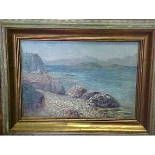 Beautifully executed oil on canvas depicting a rocky coastline with a background of water,mountains and clouds. Unsigned.