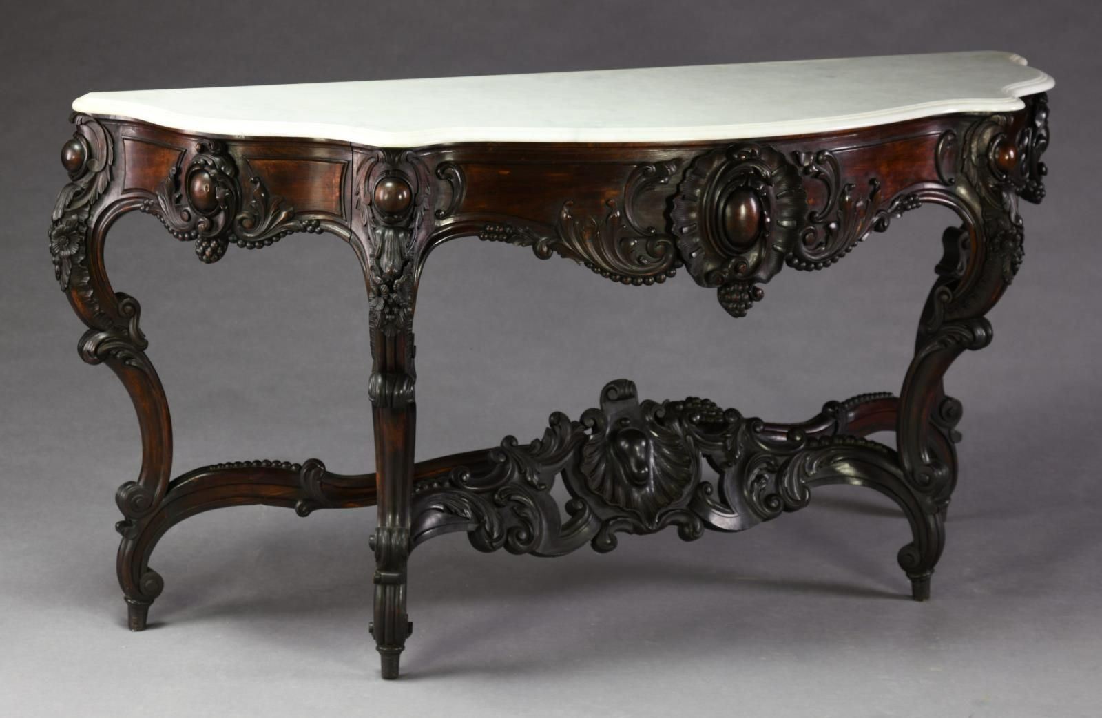 Third quarter 19th century, France. The shaped white marble top above a conforming carved frieze with raised panels and a central cartouche with hanging grapes, raised on four floral-carved cabriole legs joined by stretchers: the frontal stretcher pierced and carved with shell and leaf tips. PROVENANCE: Descended in the family of Rafael C. and Ethel Regan Goyeneche, Sr., Mexico City, Mexico; Havana, Cuba; and New Orleans, Louisiana. SIZE: 36" h x 76" w x 25 1/2" d. CONDITION: very good. (05-133/JJ). $2,500-4,500.