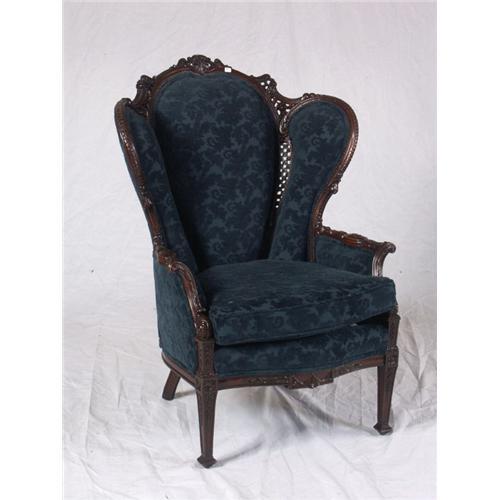ARMCHAIR: Rococo revival style walnut armchair, heavily carved with C scrolls, flowers and acanthus leaves, blue floral brocade upholstery.