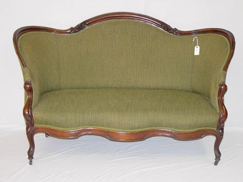 ROCOCO REVIVAL VICTORIAN BLACK WALNUT SETTEE W/ FINGER CARVED FRAME, SERPENTINE FRONT & CABRIOLE LEGS & GREEN TWEED UPHOLSTERY (62" W X 38" H X 34" D) - LOSSES & IMPERFECTIONS