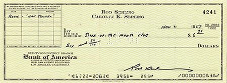 American author of science fiction novels and stories, writer and director of the television series "The Twilight Zone". Partly-printed D.S. 1p. oblong 12mo., Los Angeles, Nov. 2, 1967, a check drawn on Bank of America, filled out and signed. Serling orders a payment of $6.36. to Book of the Month Club. Punch cancels at center affect engrossment but are well clear of signature. Fine.