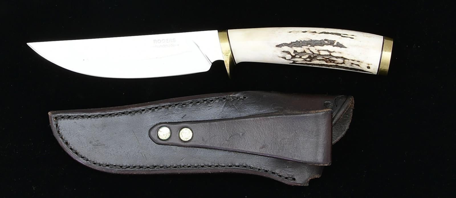 S# 276. Overall: 10". Straight point 5" blade. Brass single hilt & buttcap. Stag handle. Dark brown leather sheath w/ exotic skin inlay. CONDITION: brass hilt shows tarnish & verdigris on sides, balance of knife near excellent. Sheath very good w/ light verdigris & impressions. PROVENANCE: From the personal collection of Brad Shepherd. (02-19842-4/MD). $300-500.