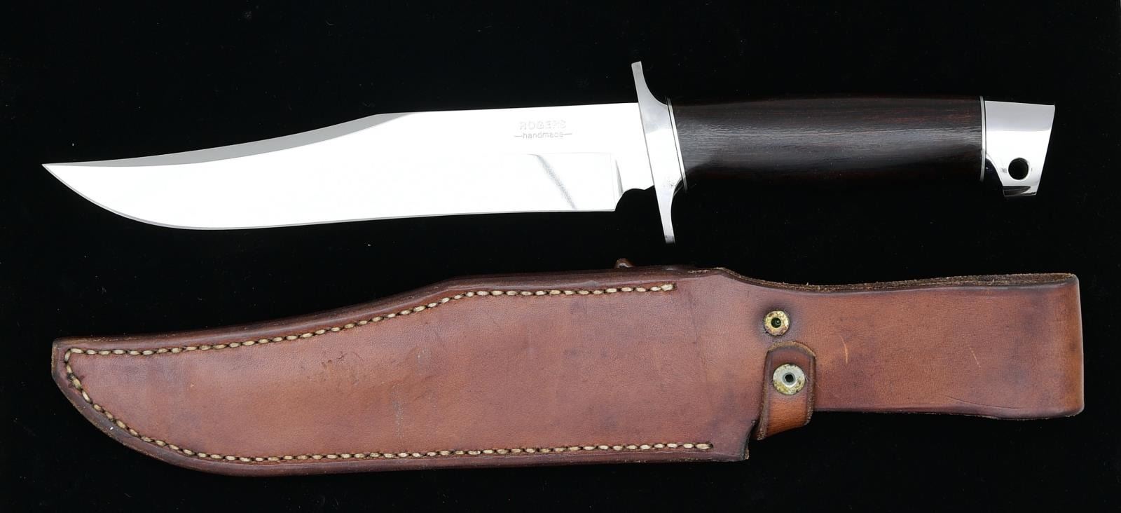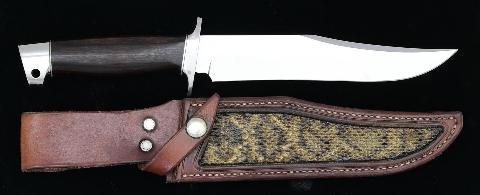 Overall: 13 3/8". Clip point Bowie style 8" blade engraved "ROGERS / -HANDMADE-". Nickel silver dbl. hilt & bird's head pommel having thong ferrule. Ironwood grip w/ nickel silver washers. Brown leather sheath w/ snake skin inlay. CONDITION: knife appears near excellent w/ light tarnish & verdigris on hilt. Very good sheath w/ light wear & spots of verdigris. PROVENANCE: From the personal collection of Brad Shepherd. (02-19842-2/MD). $450-600.