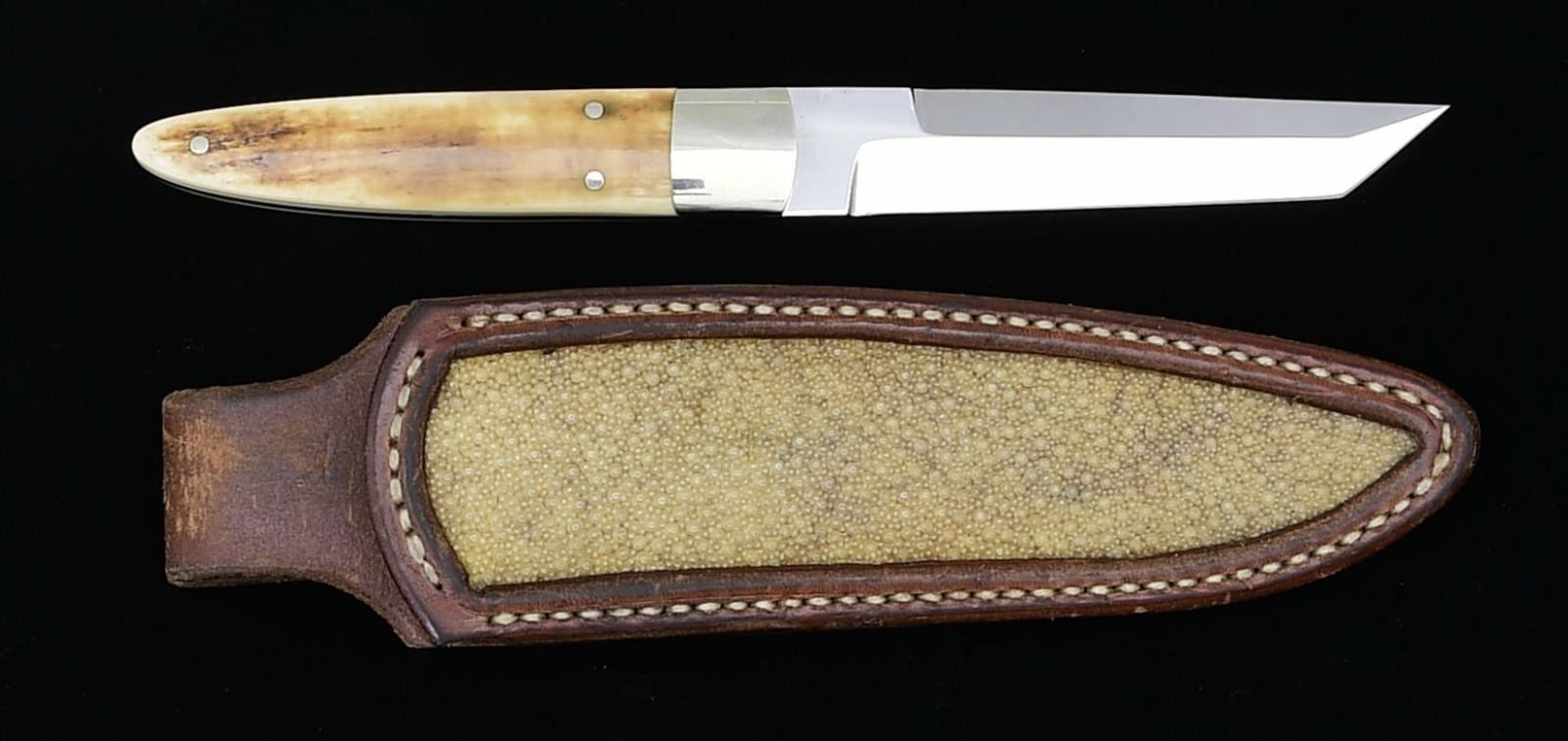 KNIFE. Overall: 9". Tanto point 4" blade w/ full tang. Nicle silver bolster. Stag panels. Brown leather sheath w/ exotic hide inlay. CONDITION: near excellent knife. Very good sheath w/ light wear. PROVENANCE: From the personal collection of Brad Shepherd. (02-19842-8/MD). $400-600.