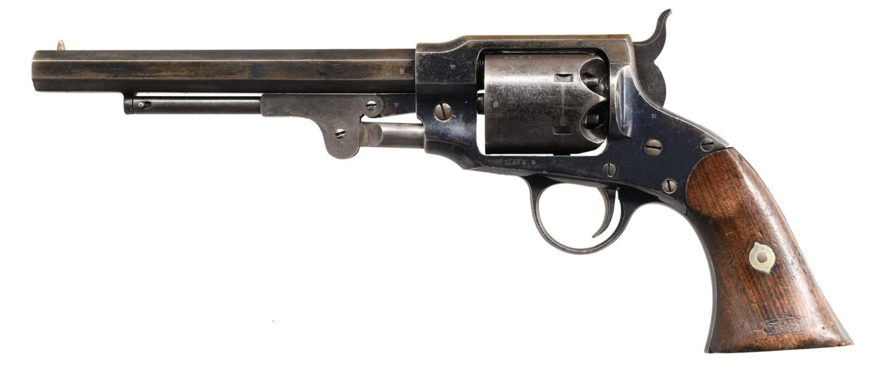Cal. 44. S# 2889. Bbl. 7 1/2", octagon with cone sight. Six-shot round cyl. Measured parts have the "B" or "P" inspector's initials. Blue finish with 2-piece walnut grips. The left grip panel has a lightly visible cartouche. Estimated quantity of 5,800 mfg. in 1865. Delivered to the US Ordnance between November 1864 and April 1865 with no records to indicate an issue. New York arms dealer Francis Bannerman acquired nearly the entire lot at a government sale in 1901 and sold them through their catalogs for the next several years. CONDITION: 50% dull, worn blue, showing scratches and marks. Wood grips show heavy wear. Bbl. retains strong rifling, showing spots of light pitting. Sound action. (01-24351/DS). ANTIQUE. $1,200-1,500.