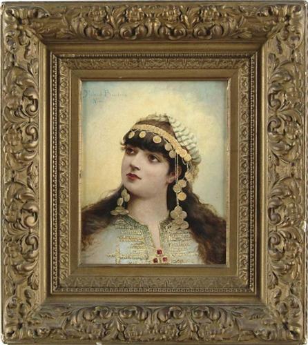 ROLAND BAUDUIN (French, 19th Century) “NINI”. Oil on cradled wood panel portrait of a young Gypsy girl. She looks up to her right and is wearing a coin headband with green and white turban. She wears a fancy green and gold dress with long brown hair over her shoulders. Signed upper left and titled. Appears to be housed in its original gesso decorated gilt frame. SIZE: 9-1/2” x 7-1/2”. CONDITION: Some inpainting, very good. 9-27063