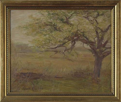 ROLAND ROOD (American, 19th/20th Century) THE BLOSSOMING APPLE TREE. Oil on canvas spring scene shows a blossoming tree against a landscape. Signed lower left "Roland Rood 1910". Also signed on reverse and dated. Housed in a gilt molded wood period frame. SIZE: 18" x 22". CONDITION: Very good. 9-27624