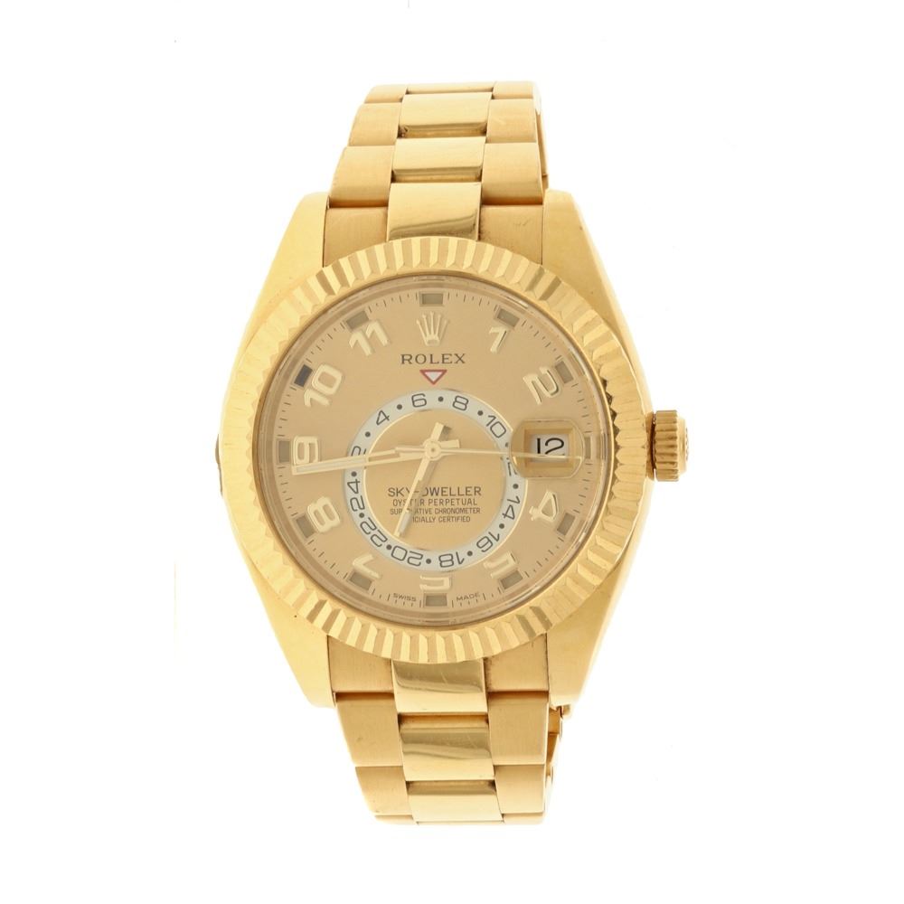 ROLEX: [1] 18k yellow gold Rolex Sky-Dweller watch, 42mm case, gold dial with 1 sub dial, 18k fluted bezel, oyster strap; Model 326938; Serial Number 220K9631; comes with box; 248.7 grams.
